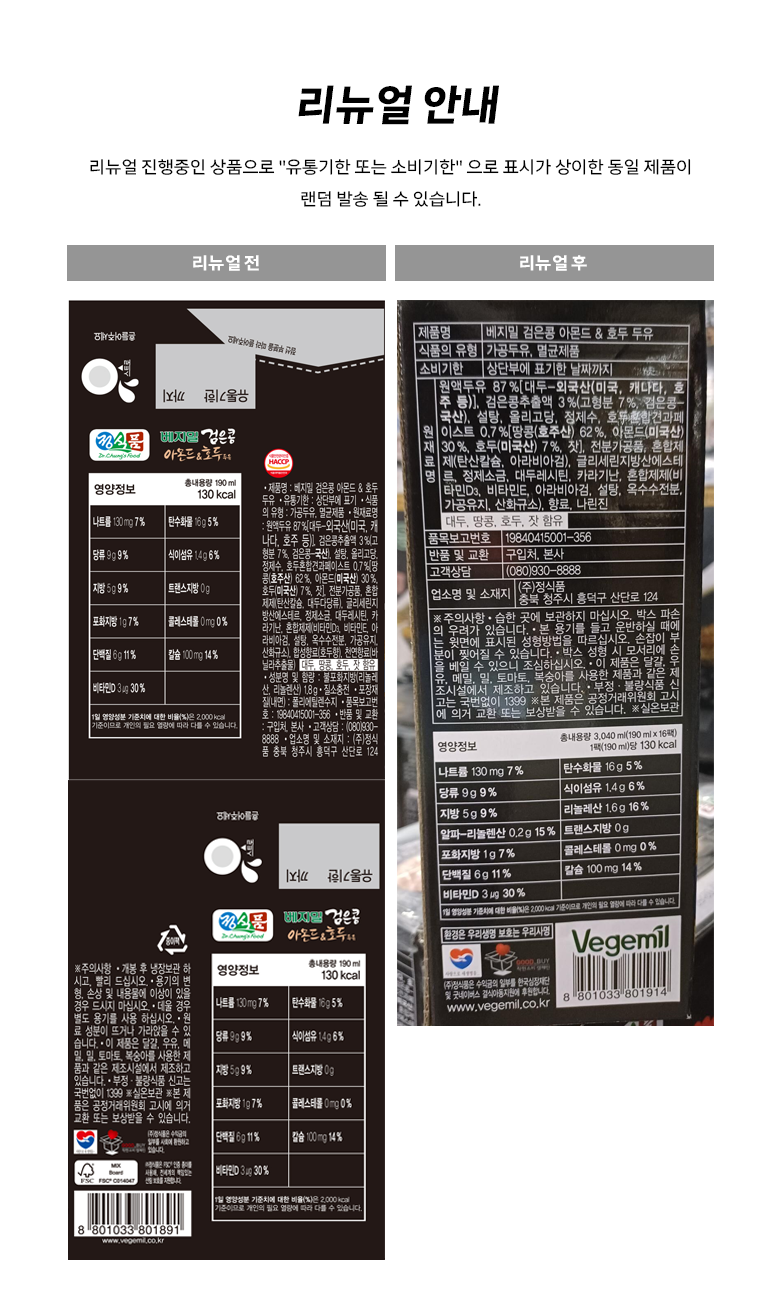 | 제품명 | 베지밀 검은콩 아몬드 & 호두 두유 | 식품의 유형 | 컨텐츠 참조 |