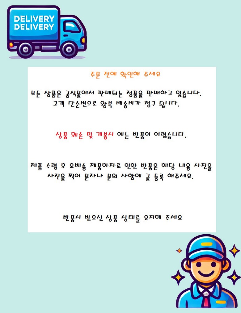 - ㆍ모니터 해상도의 차이로 인해 색상이나 이미지가 실제와 달라, 고객이 단순 변심으로 교환/반품을 무료로 요청하는 경우