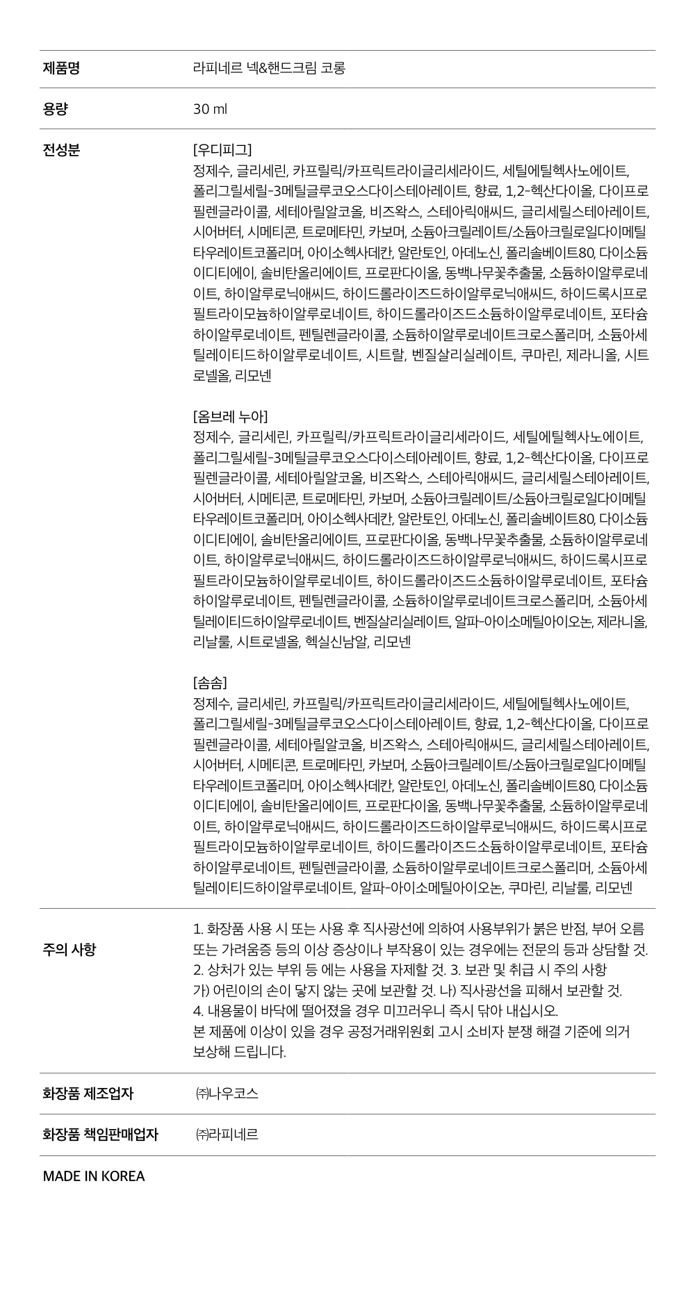 | 화장품제조업자, 화장품책임판매업자 및 맞춤형화장품판매업자 | 컨텐츠 참조 | 제조국 | 컨텐츠 참조 |