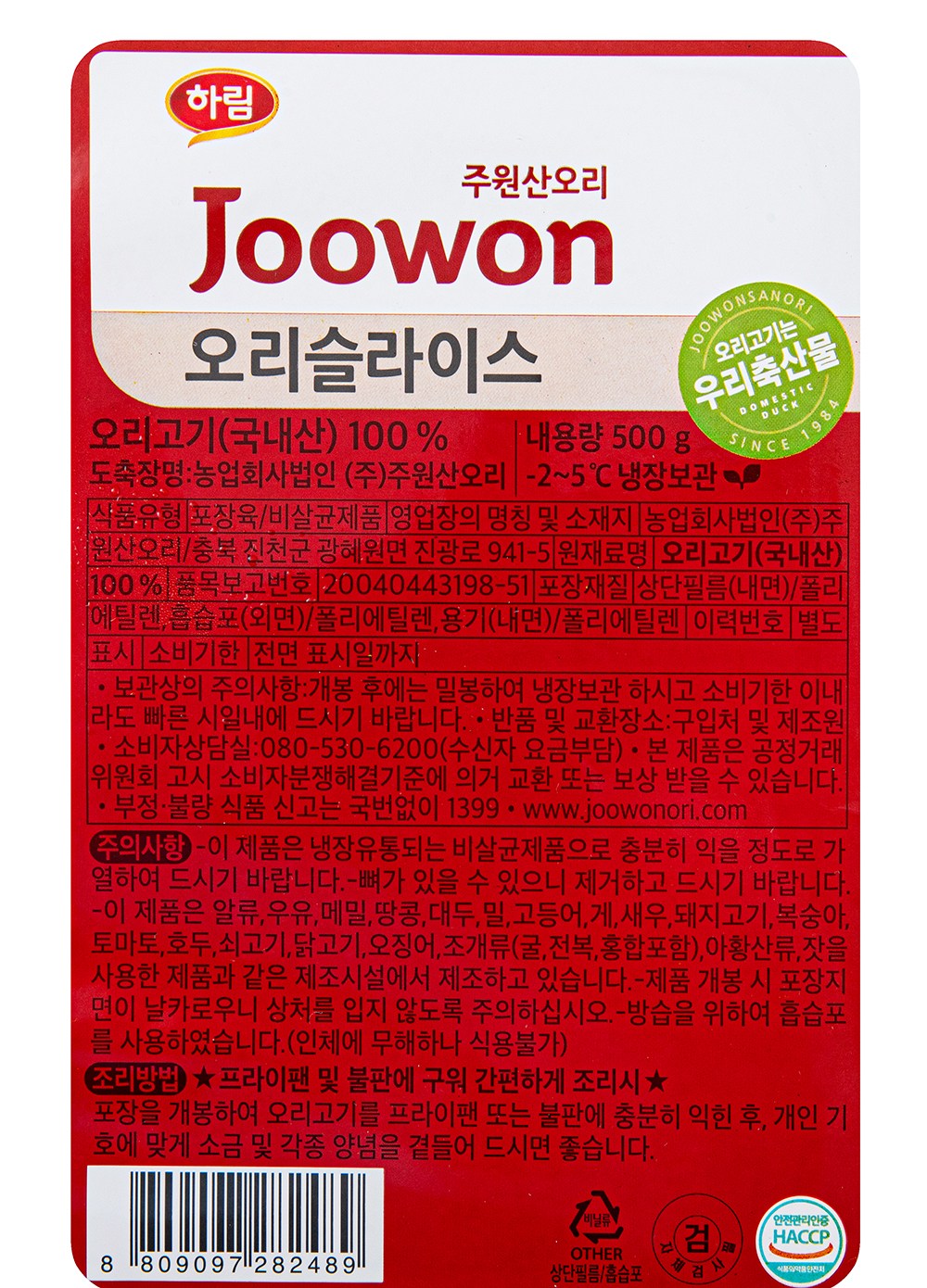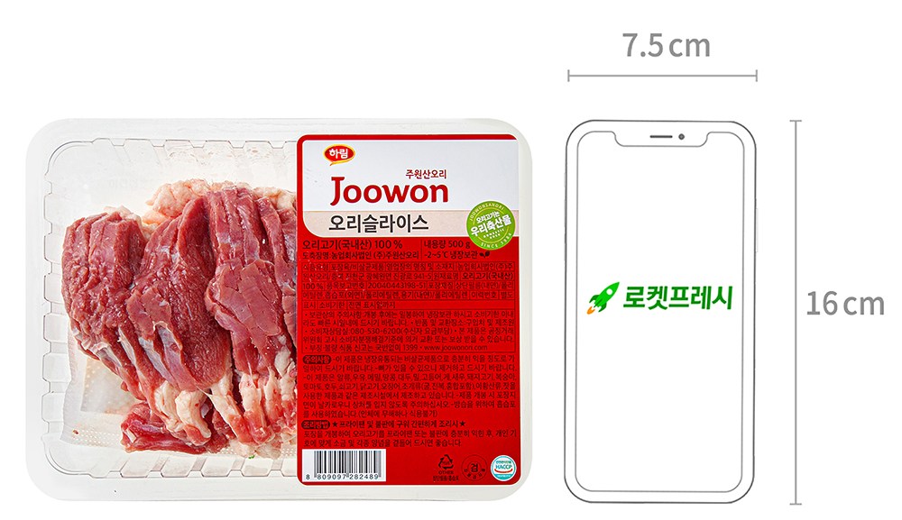 | 품목 또는 명칭 | 오리슬라이스 | 포장단위별 내용물의 용량(중량),수량,크기 | 500g x 1개입 x 3개 |