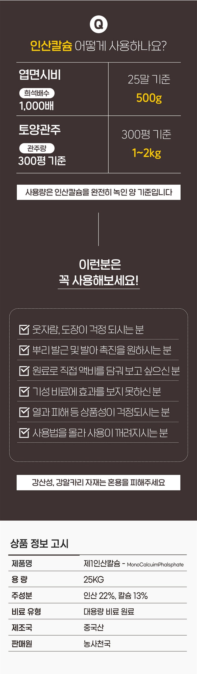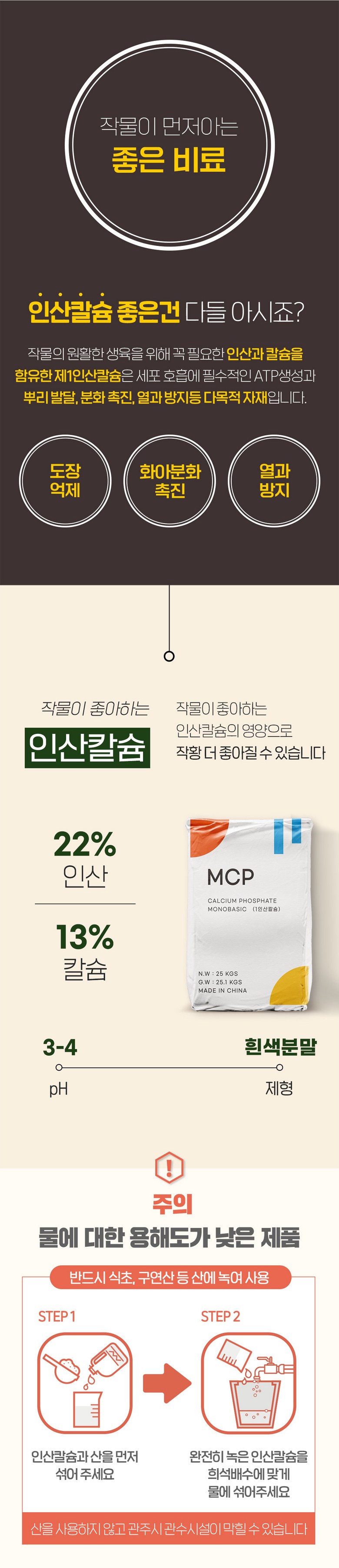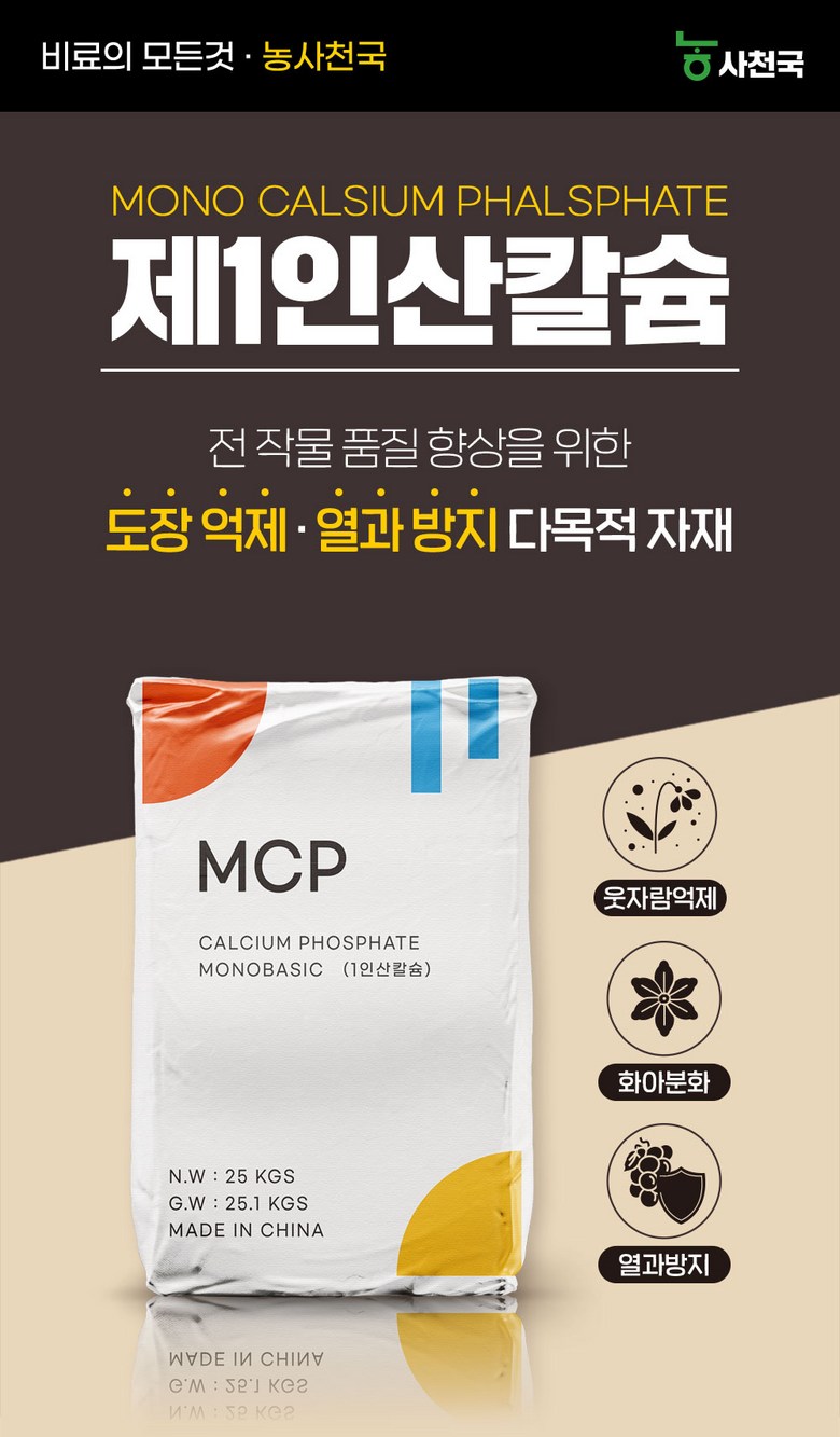 MCP 제1인산칼슘 25kg - 웃자람 도장 억제 당도 향상 높은 칼슘함량 액비 제조 분말 비료원료
