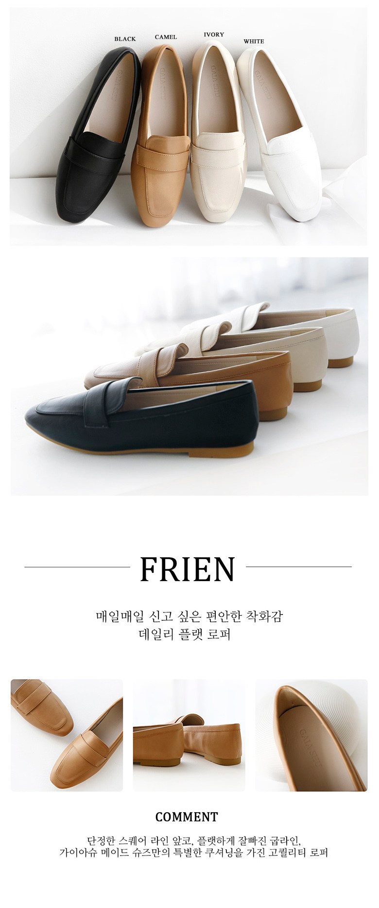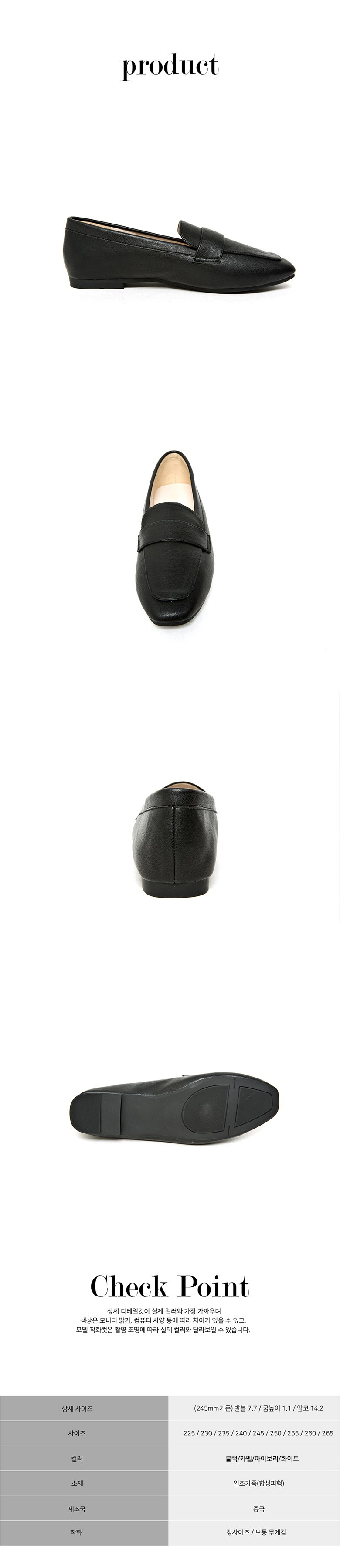 | 치수 | 발길이: 225,230,235,240,245,250,255,260,265 (mm) / 굽높이: 1 (cm) | 제조자(수입자) | 가이아슈 |