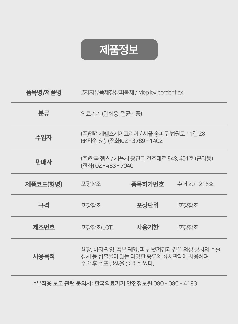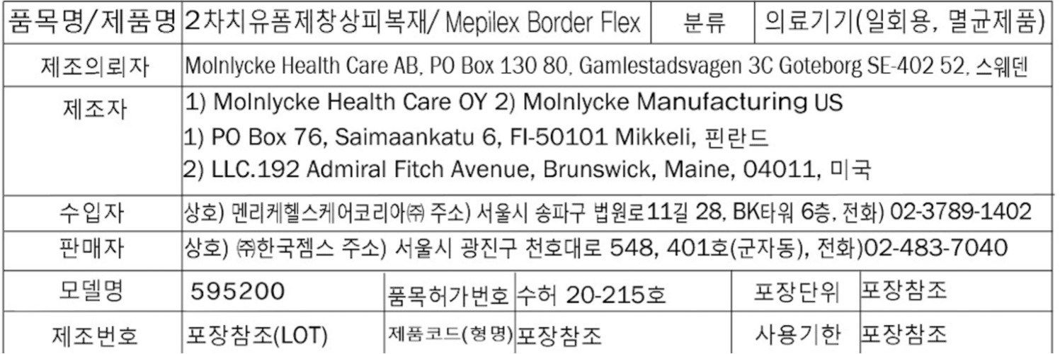 | 품명 및 모델명 | 2차치유폼제창상피복재 / 595200 | 허가∙인증∙신고번호 (의료기기법에 따른 허가∙인증∙신고 대상 의료기기에 한함) | 품목허가번호 : 수허 20-215 호 |