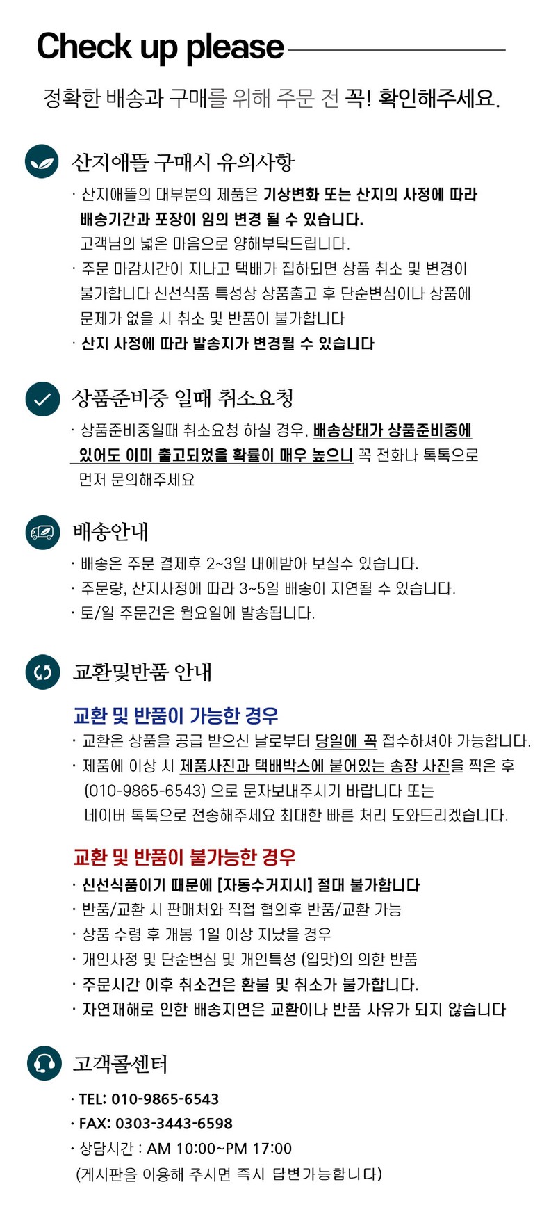 - ㆍ모니터 해상도의 차이로 인해 색상이나 이미지가 실제와 달라, 고객이 단순 변심으로 교환/반품을 무료로 요청하는 경우