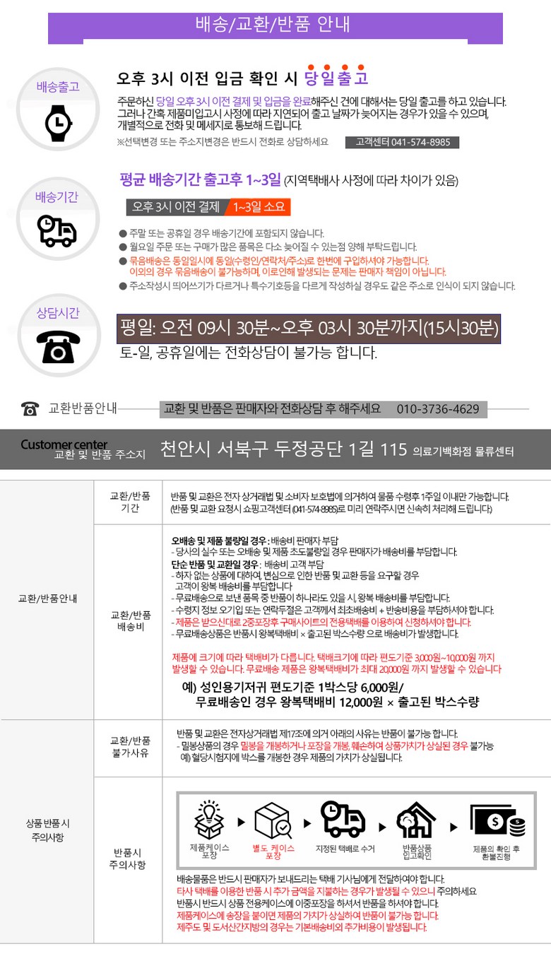 - ㆍ모니터 해상도의 차이로 인해 색상이나 이미지가 실제와 달라, 고객이 단순 변심으로 교환/반품을 무료로 요청하는 경우
