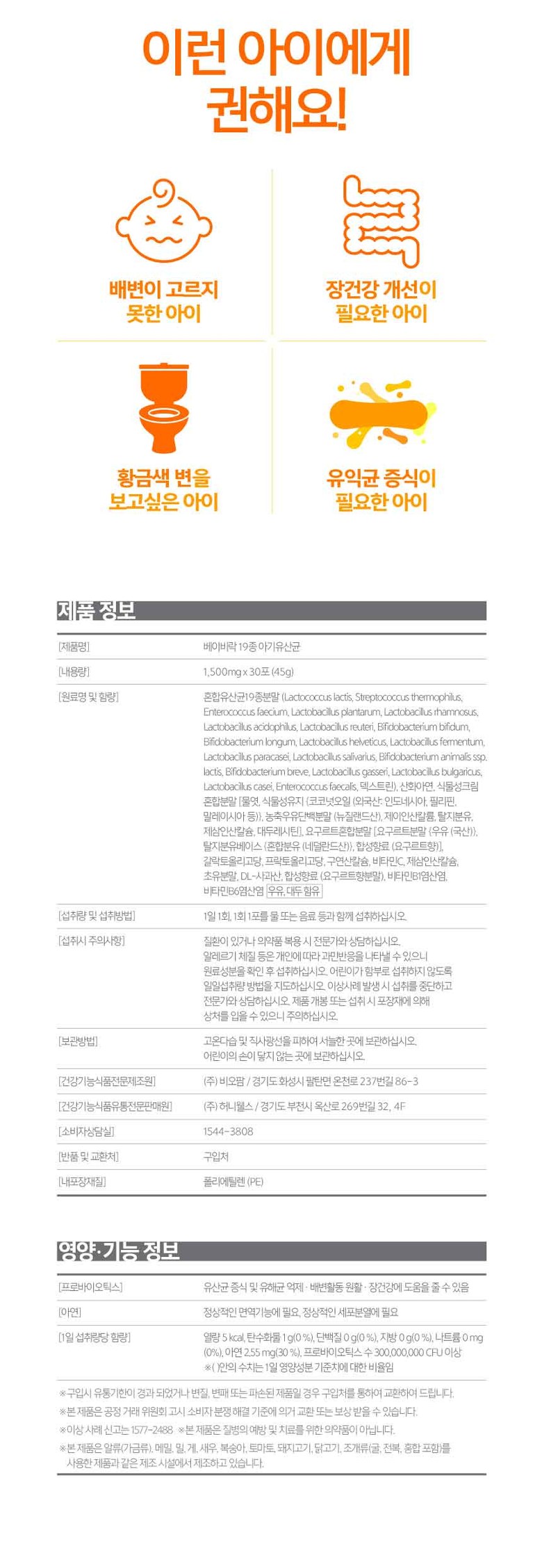 | 제품명 | 베이비락 19종 생유산균 60포 | 제조업소의 명칭과 소재지 | (주)비오팜 |