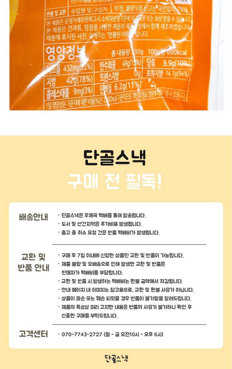 | 교환/반품 신청 기준일 | ㆍ단순변심에 의한 교환/반품은 제품 수령 후 7일 이내까지, 교환/반품 제한사항에 해당하지 않는 경우에만 가능 (배송비용과 교환/반품 비용 왕복배송비 고객부담) ㆍ상품의 내용이 표시·광고의 내용과 다른 경우에는 상품을 수령한 날부터 3개월 이내, 그 사실을 안 날 또는 알 수 있었던 날부터 |