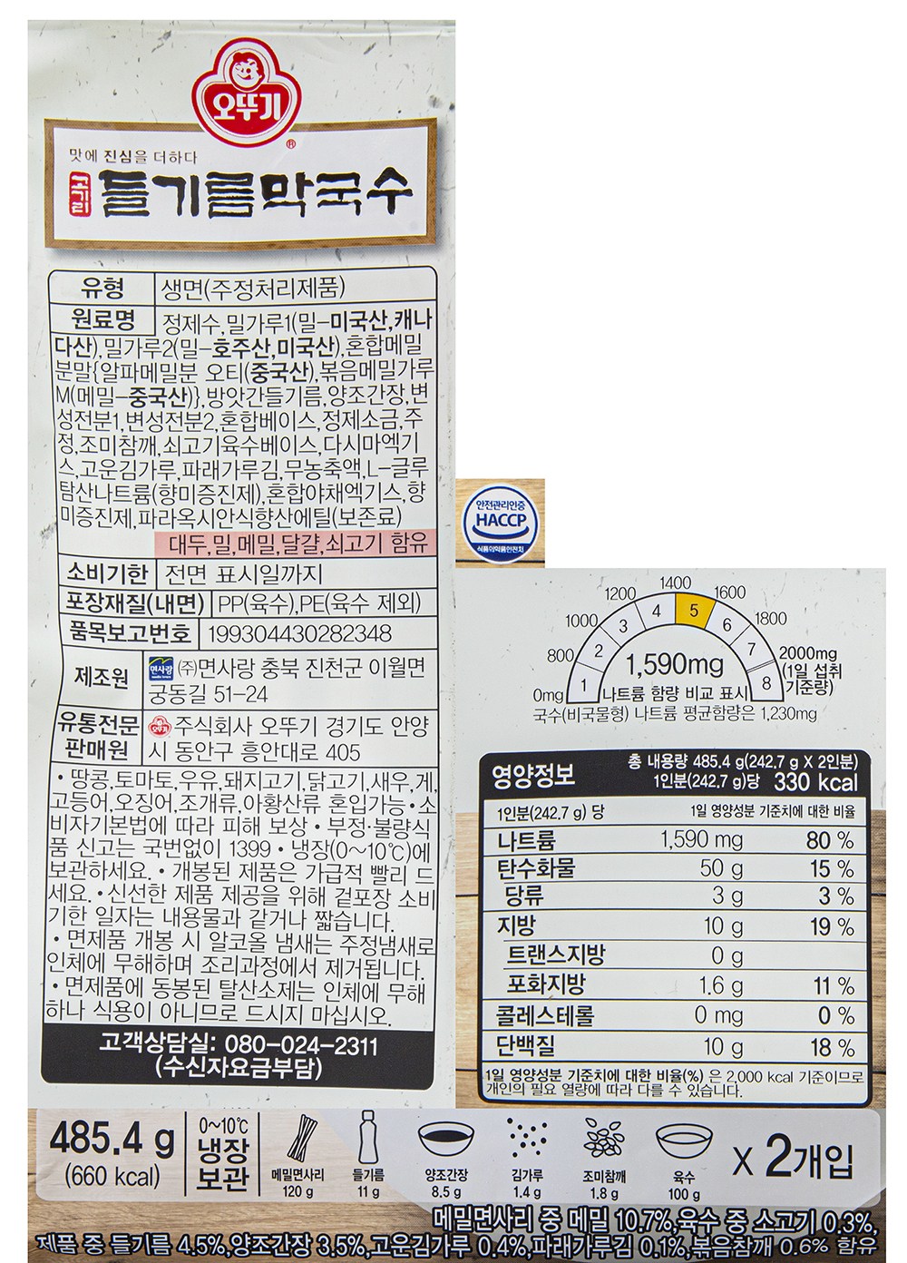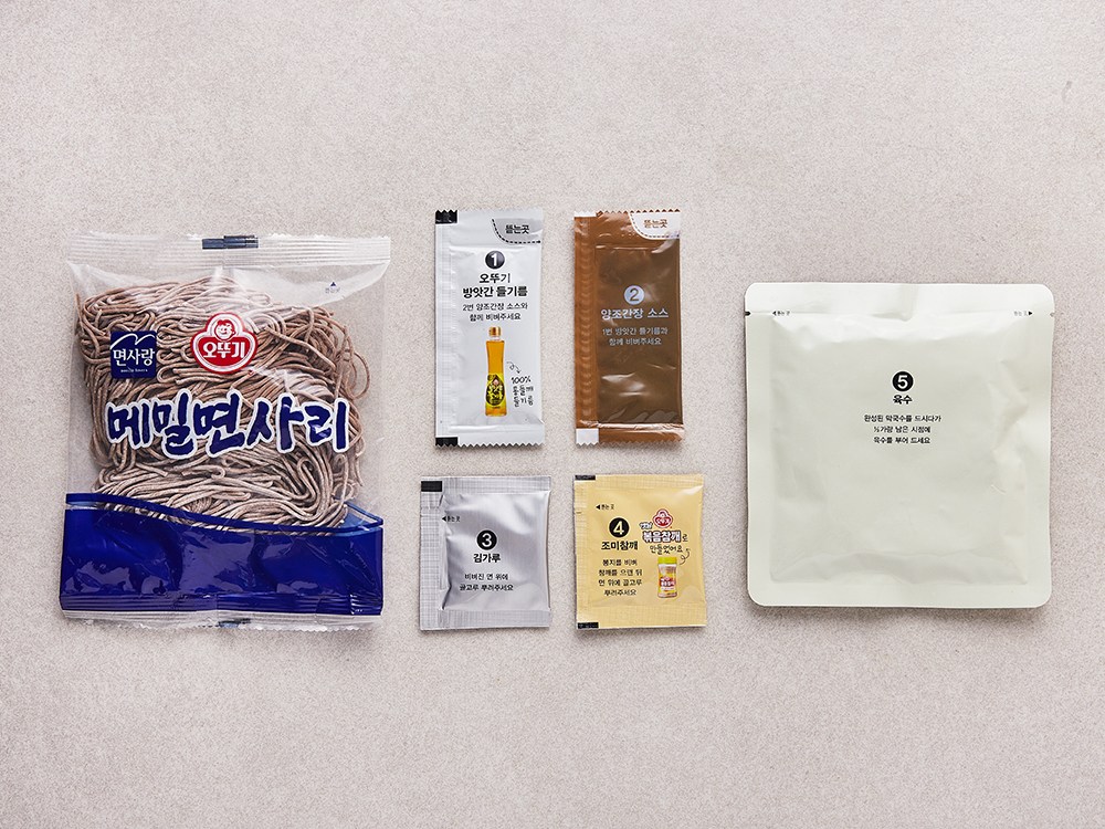 메밀면사리, 오뚜기 방앗간 들기름, 양조간장 소스, 김가루, 조미참깨, 육수가 각 2팩씩, 총 2인분으로 구성되어 있습니다.
