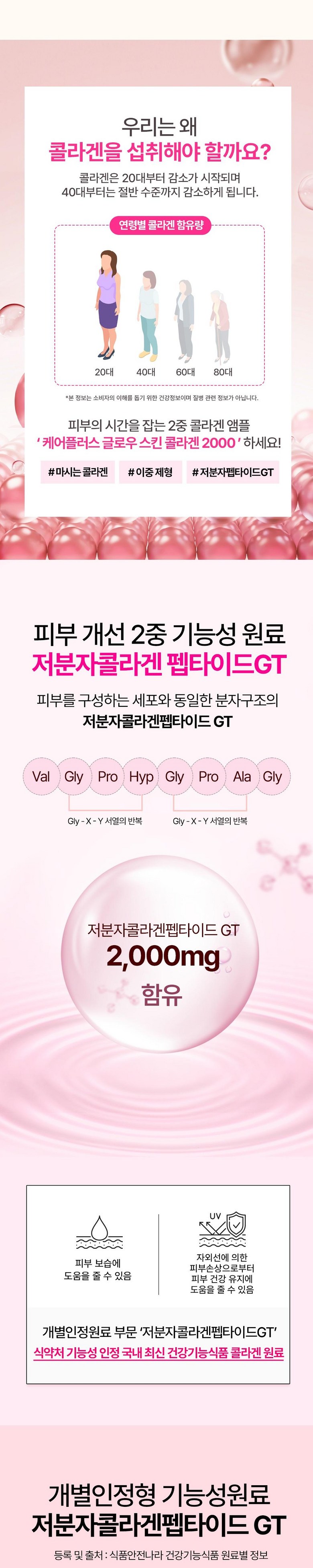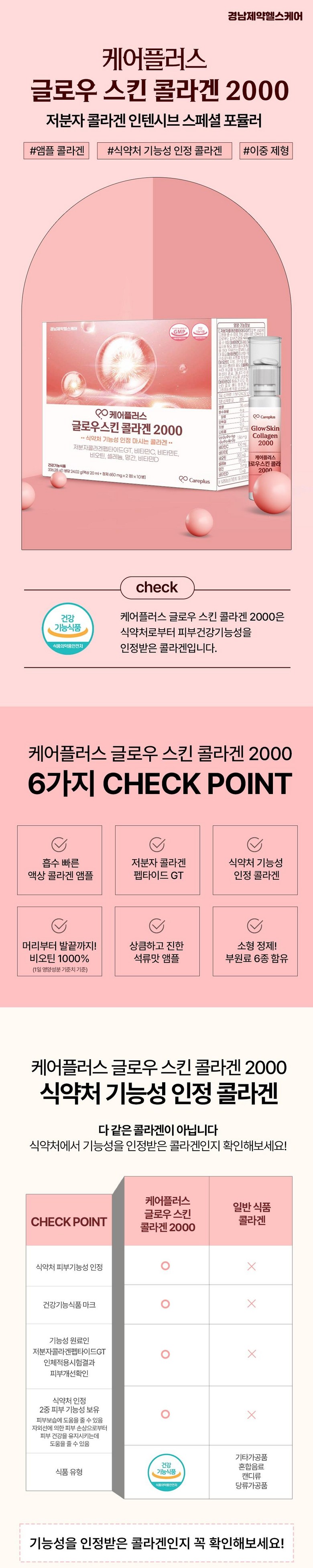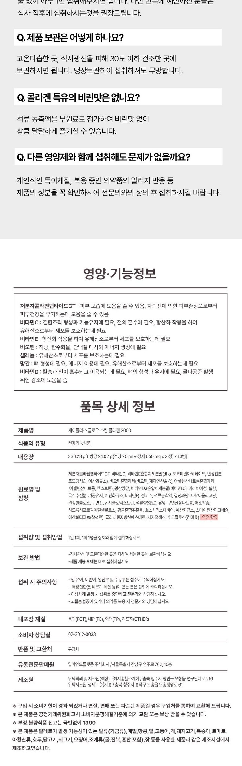 | 제품명 | 케어플러스 글로우 스킨 콜라겐 2000 | 제조업소의 명칭과 소재지 | 위탁의뢰 및 제조원(액상):(주)서흥헬스케어/충북 청주시 청원구 오창읍 연구단지로 216위탁제조원(정제):(주)서흥/충북 청주시 흥덕구 오송읍 오송 생명로 61 |