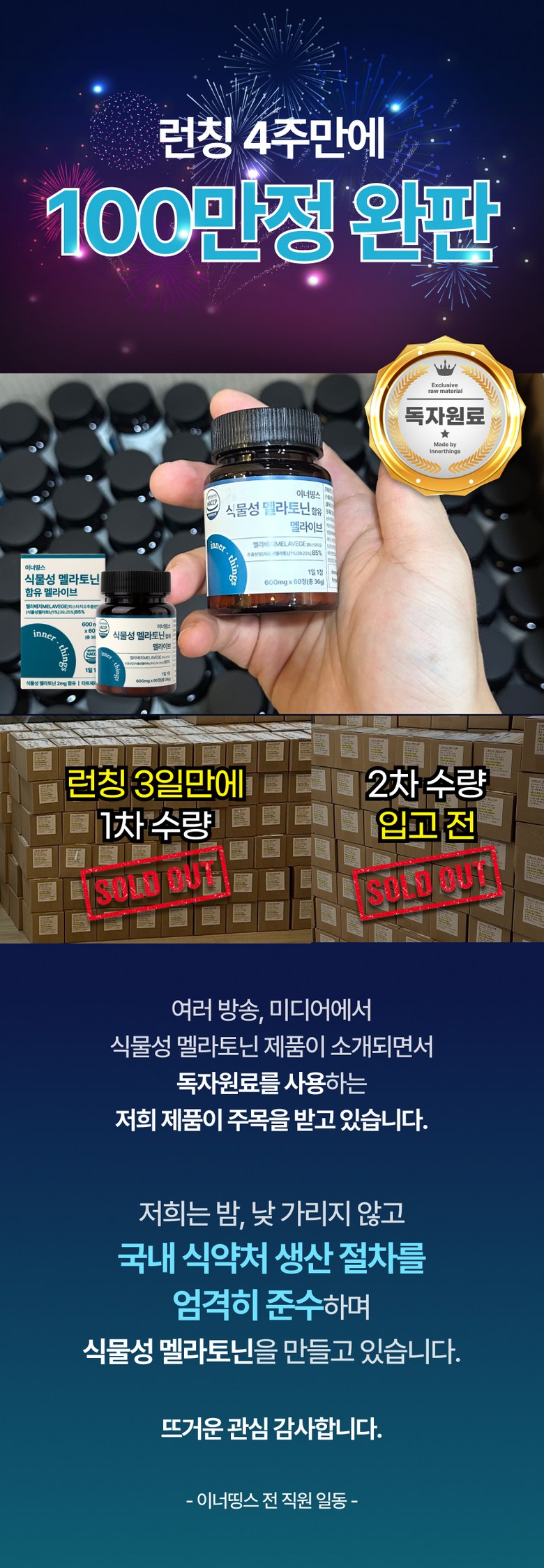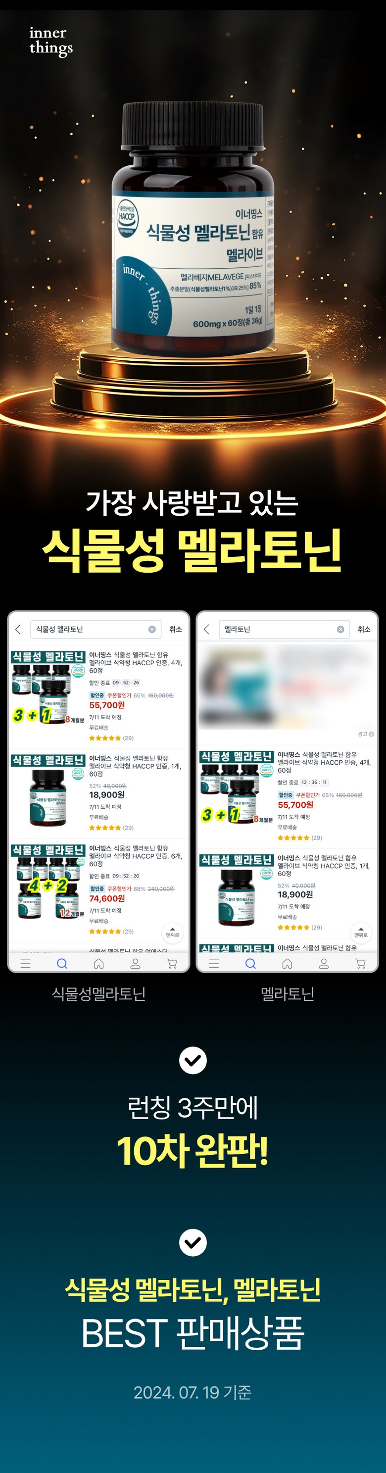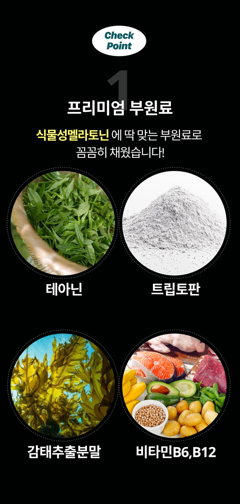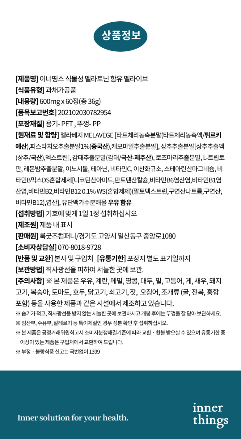 | 원재료명 및 함량 | 멜라베지[타트체리농축분말(이란산),피스타치오추출분말1%(중국산),캐모마일추출분말], 상추추출분말[상추추출액(상추/국산),덱스트린], 감태추출분말(감태/국산-제주산), 로즈마리추출분말, L-트립토판, 레몬밤추출분말, 이노시톨,테아닌, 비타민C, 이산화규소, 스테아린산마그네슘, 비타민B믹스DS혼합제제[니코틴산아미드,판토텐산칼슘,비타민B6염산염,비타민B1염산염,비타민B2,비타민B12 0.1% WS(혼합제제)(말토덱스트린,구연산나트륨,구연산,비타민B12),엽산], 유단백가수분해물 우유 함유 | 영양성분 | 상품 상세페이지 참조 |