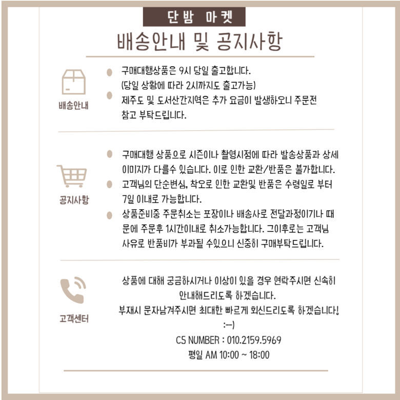 | 배송기간 | ㆍ도서산간 지역 등은 배송에 3-5일이 더 소요될 수 있습니다. - 천재지변, 물량 수급 변동 등 예외적인 사유 발생 시, 다소 지연될 수 있는 점 양해 부탁드립니다. | ||