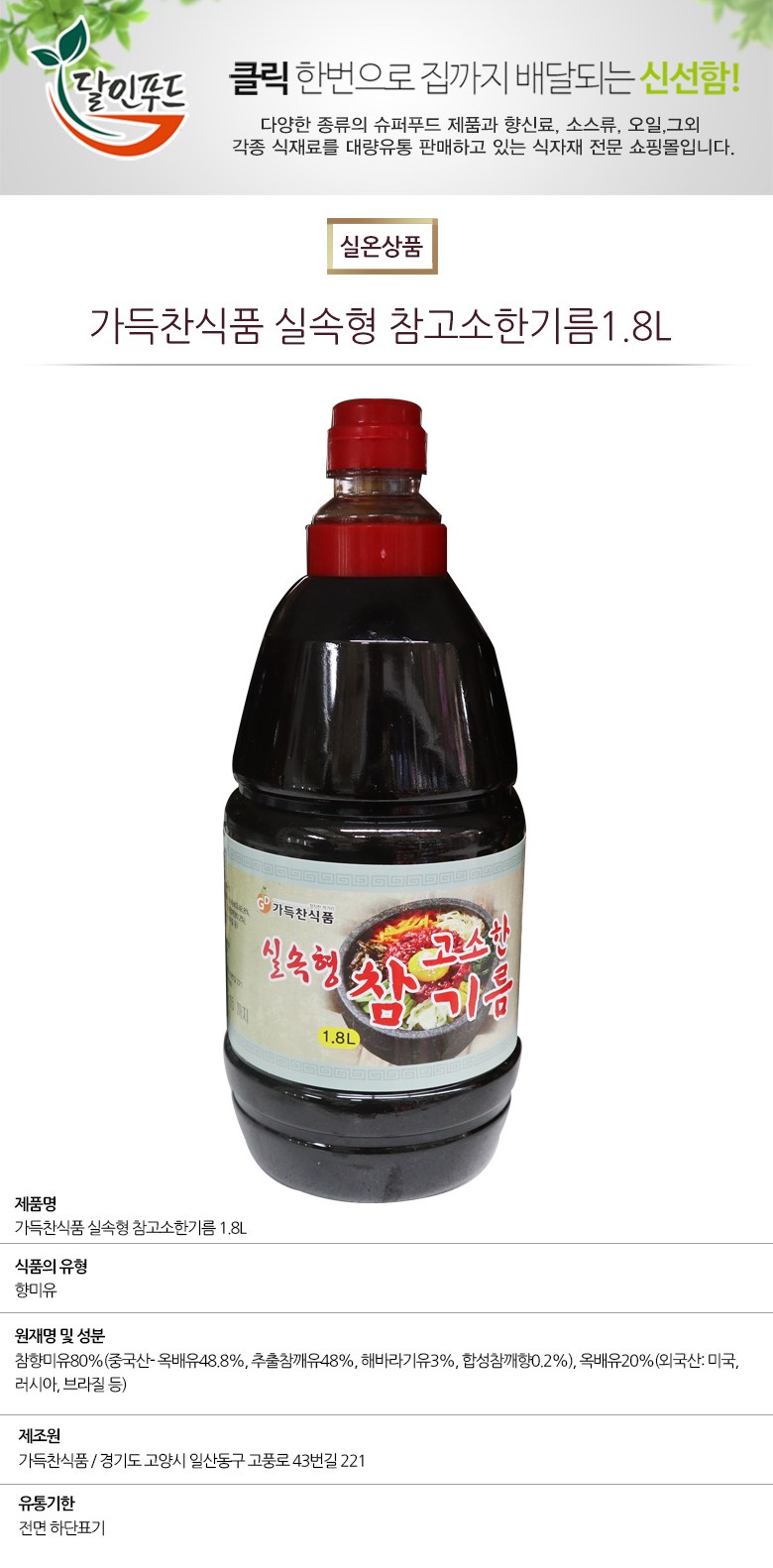 | 제품명 | 가득찬식품 실속형 참고소한참기름1.8L 1개 | 식품의 유형 | 참기름 |