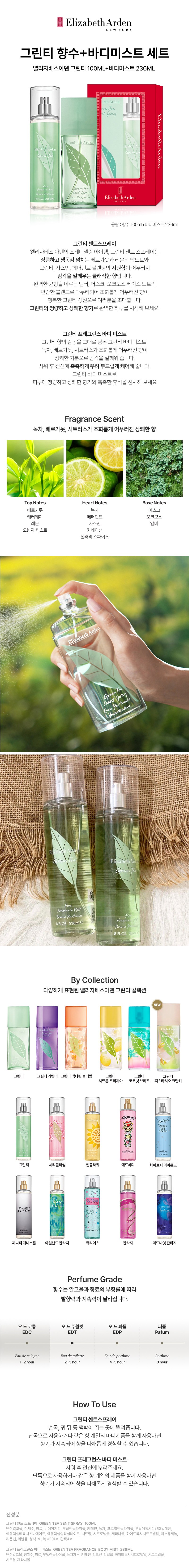 | 화장품제조업자, 화장품책임판매업자 및 맞춤형화장품판매업자 | 향수: BEAUTY GE Sl / 엘리자베스아덴코리아(유), 바디미스트: Beautyge Mexico S.A. DE C.V. / 엘리자베스아덴코리아(유) | 제조국 | 향수: 스페인, 바디미스트: 멕시코 |