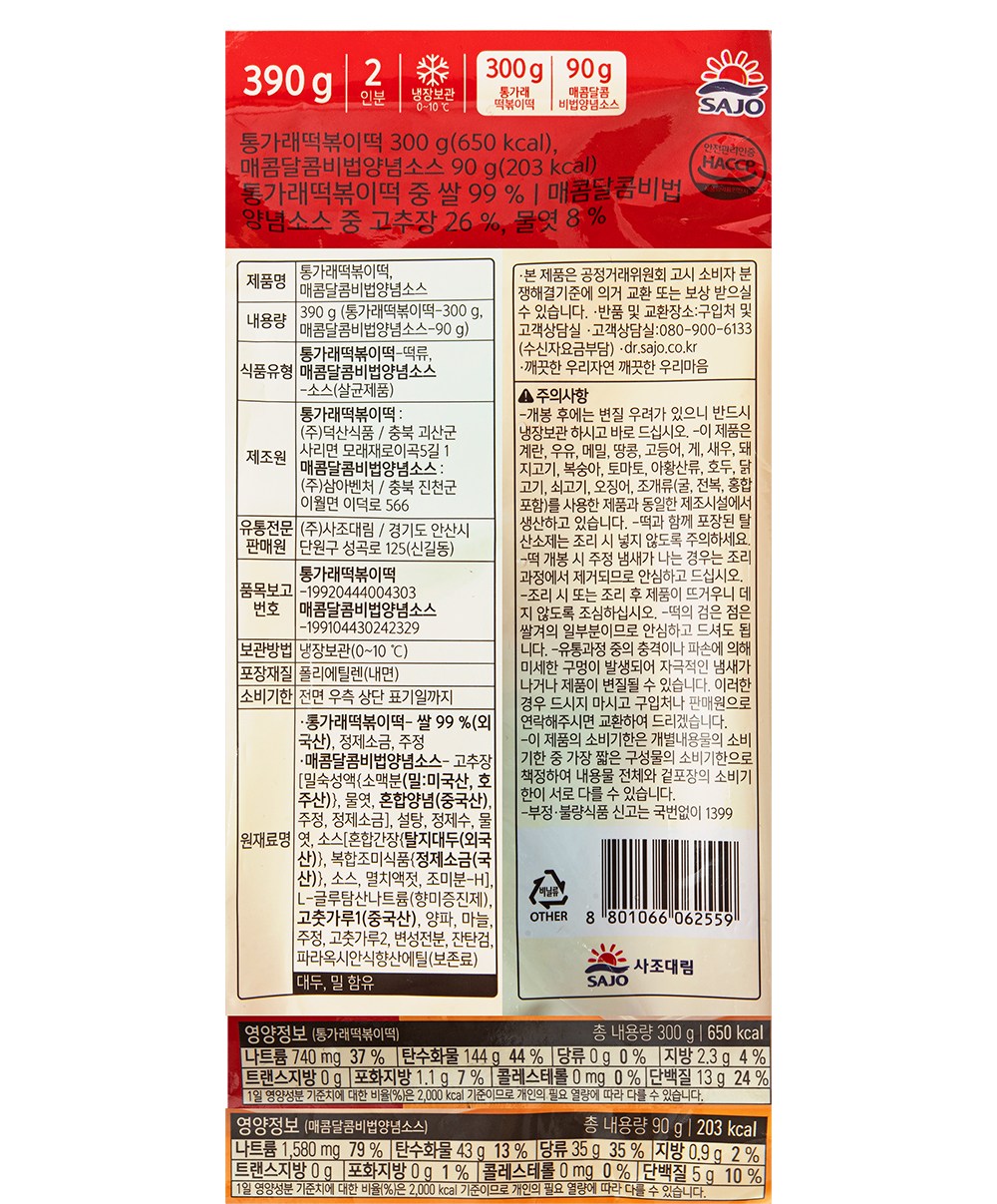 통가래떡볶이 떡과 매콤달콤 비법 양념소스로 구성되어 있습니다.