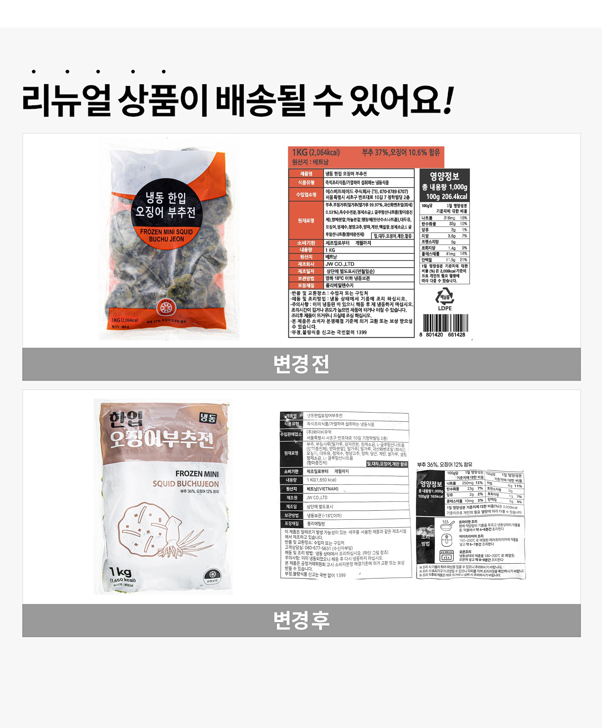 전을 반죽할 필요 없이 바로 구워 먹을 수 있는 한입 오징어 부추전입니다. 쏙쏙 집어먹기 좋은 크기로 미리 부쳐냈어요. 오징어 부추전이 생각날 때, 재료 손질 없이 냉동실에서 꺼내어 바로 조리할 수 있죠. 오징어의 쫄깃한 식감과 부추의 향긋함이 일품이랍니다. 간식이나 밥반찬, 술안주로 활용해보세요.