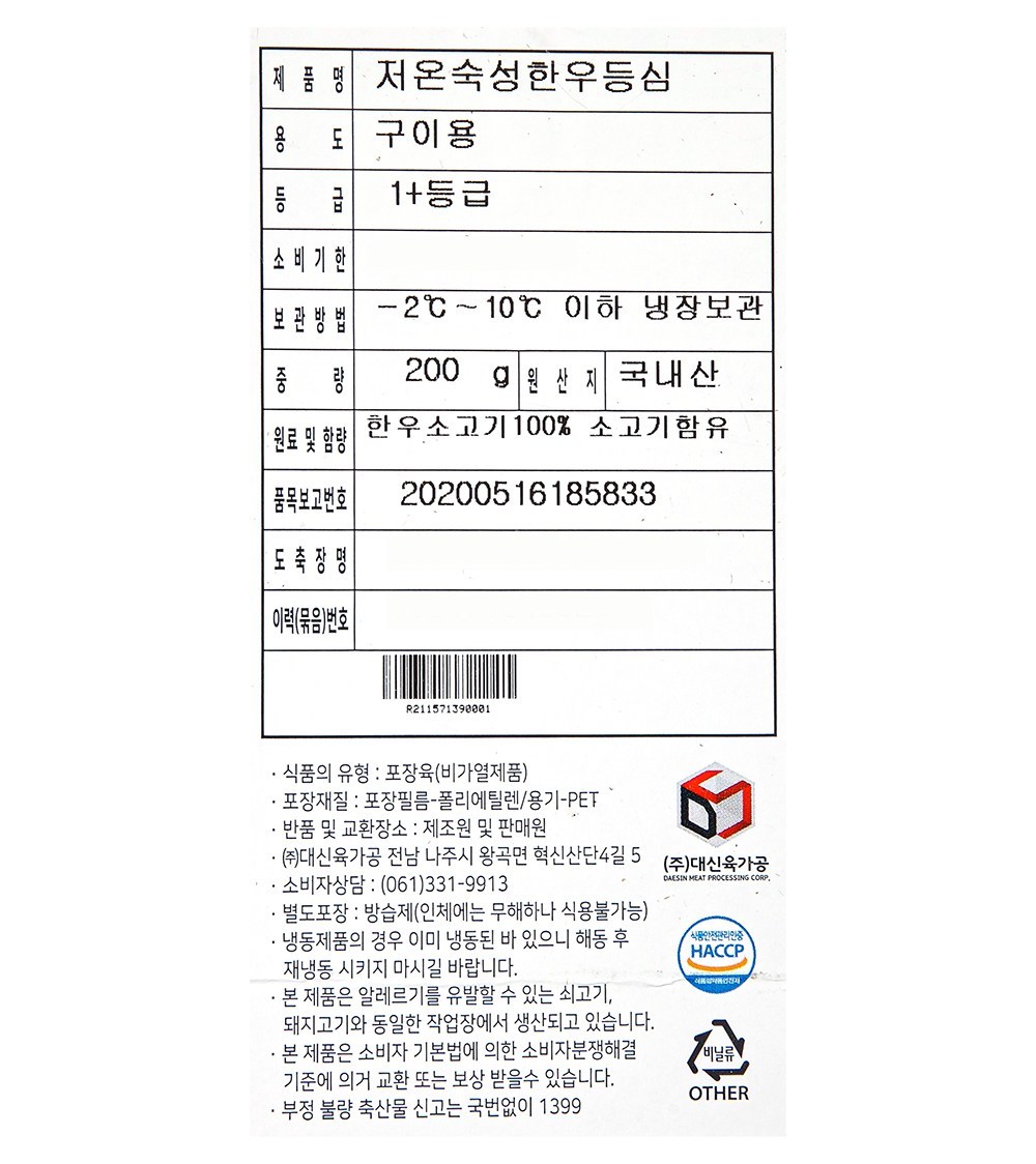 | 제조연월일, 소비기한 또는 품질유지기한 | 주문일 기준으로 제조 또는 포장되므로 해당 정보가 매번 변경되어 정확한 정보 제공이 어렵습니다. 정확한 제조연월일을 확인하시려면 쿠팡 고객센터(1577-7011)로 문의 바랍니다. | 세부 품목군별 표시사항 | 축산물 등급표시 : 1+등급 / 이력번호 표시유무 : 이력번호 표시제품임 |