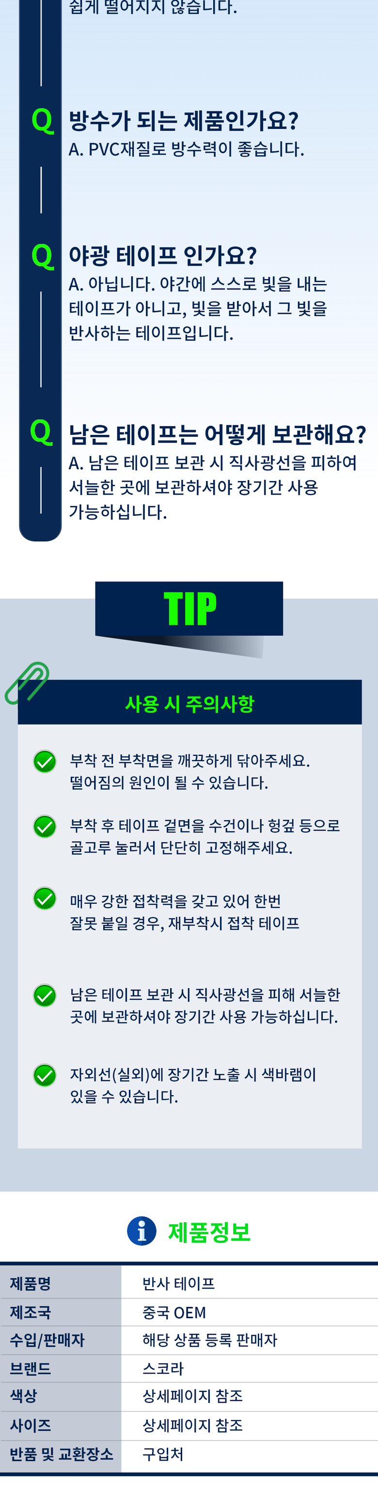 | 품명 및 모델명 | 스코라 고휘도 빛 반사 테이프 5cm x 5m 안전 안내 표시 | 인증/허가 사항 | 해당 없음 |