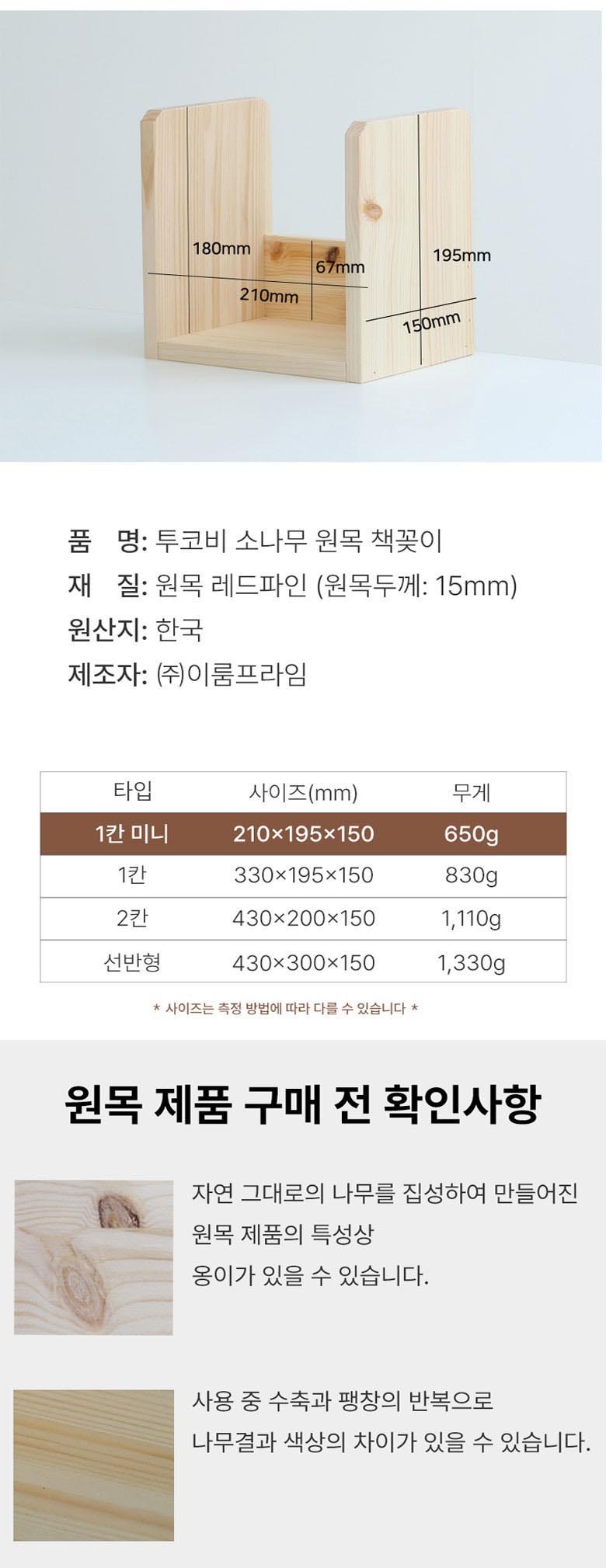 | 품명 및 모델명 | 투코비 소나무 원목 책꽂이 1칸 미니 | 인증/허가 사항 | 해당없음 |