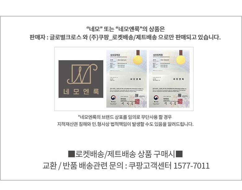 | 소비자상담 및 교환반품 문의 | 쿠팡고객센터 1577-7011 배송 및 환불/교환에 대한 문의는 마이쿠팡-고객센터 내 상담하기를 이용해주세요. | ||