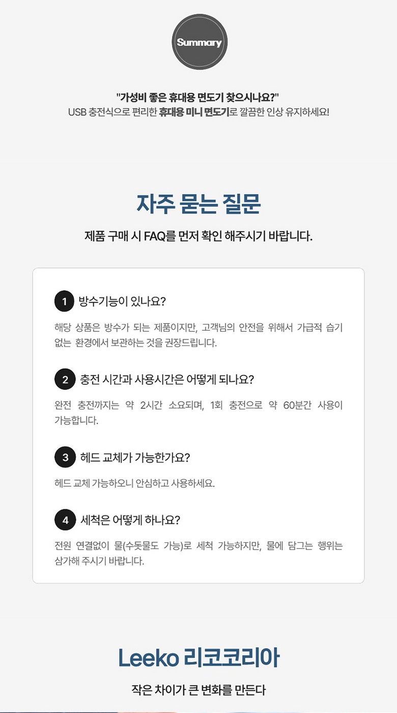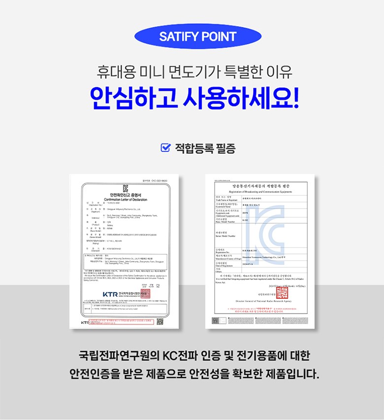 | 품명 및 모델명 | 휴대용 미니 면도기 | KC 인증정보 | 상품 상세페이지 참조 |
