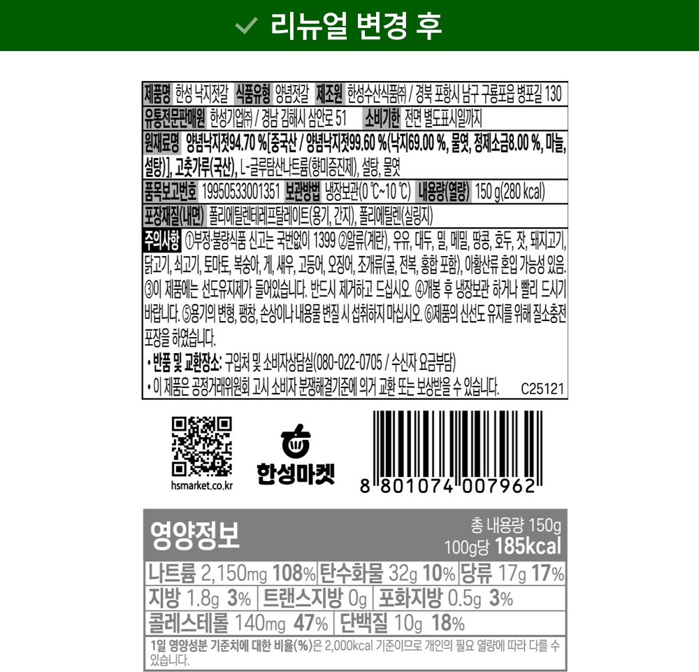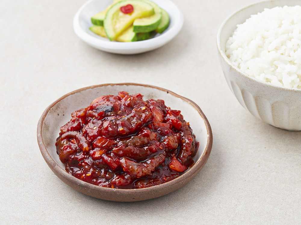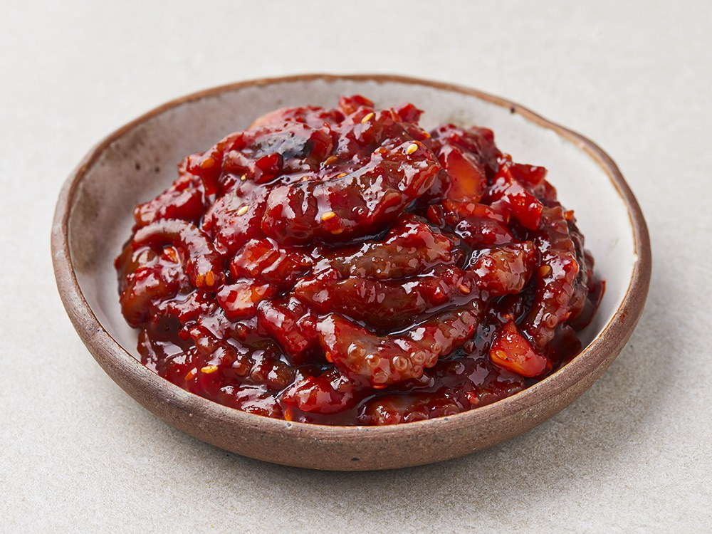 오동통하고 쫄깃쫄깃한 낙지젓갈이에요. 입맛을 사로잡는 매콤한 풍미가 일품인데요. 짠맛이 적고 담백해 맛있게 드실 수 있답니다. 따끈한 밥에 한 점 얹어 드시거나, 비빔밥으로 즐겨보세요. 기름진 음식에 곁들이면 느끼함을 단번에 잡아줄 별미가 될 거예요.