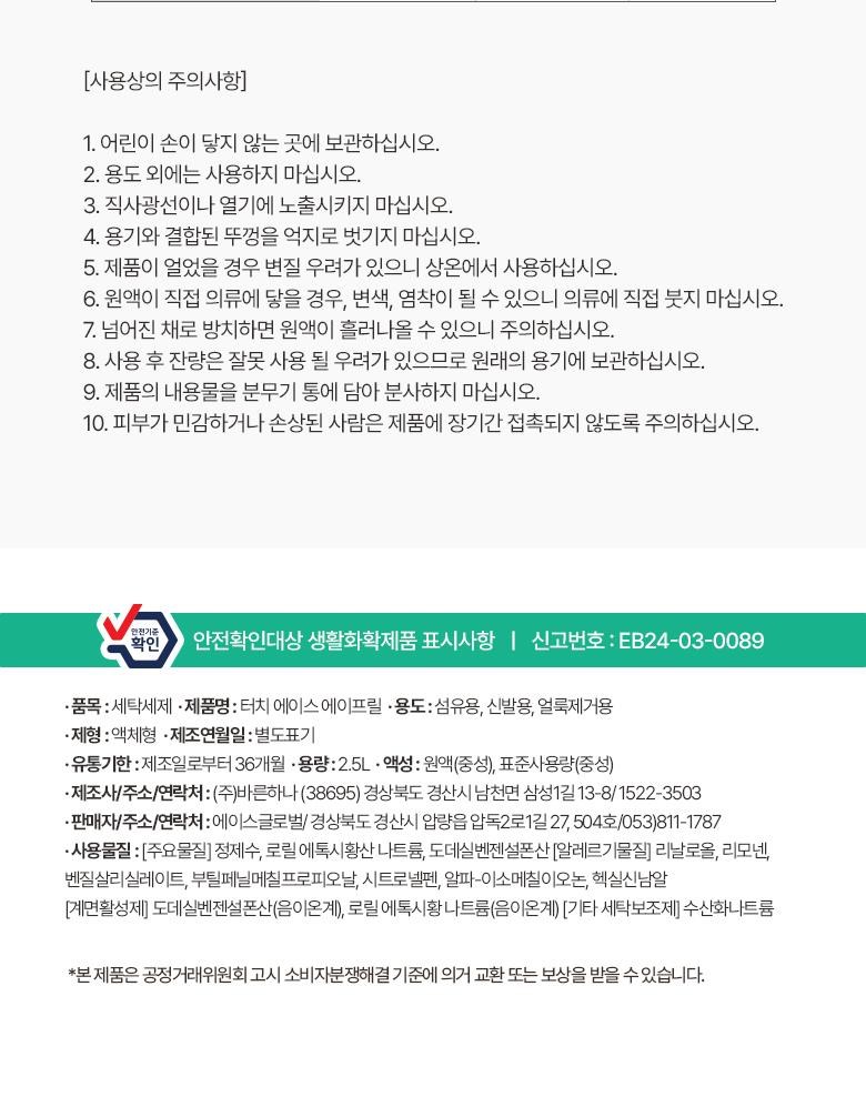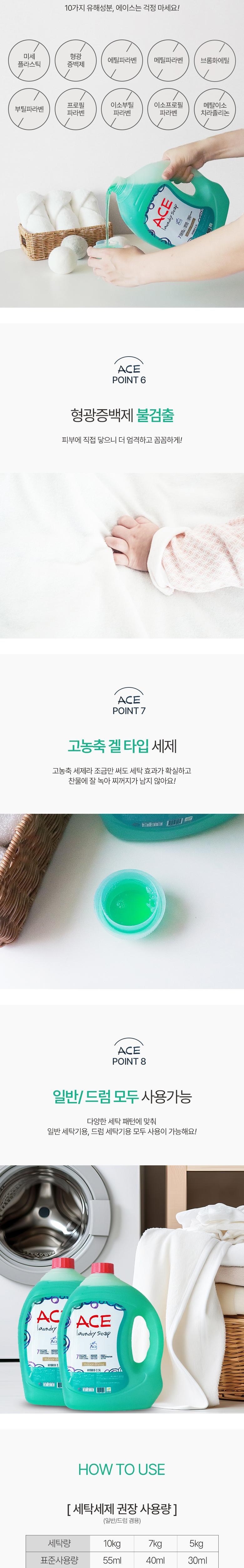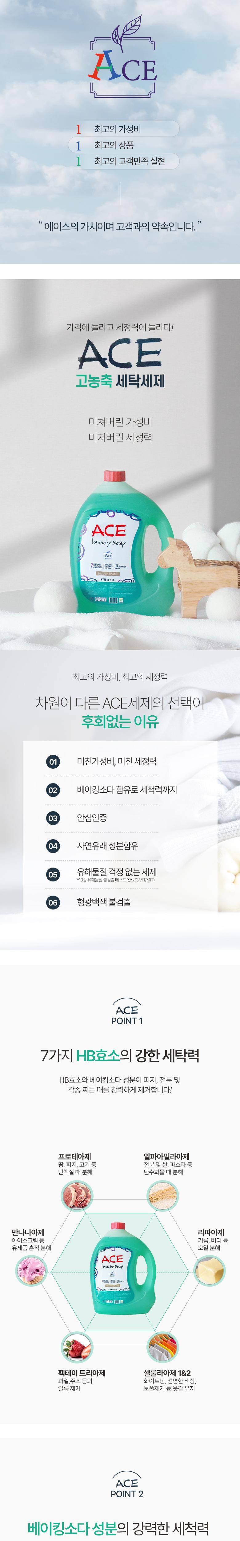 | 품명 및 모델명 | 에이스 고농축 액체세탁세제 일반드럼겸용 | 인증/허가 사항 | 상품 상세페이지 참조 |