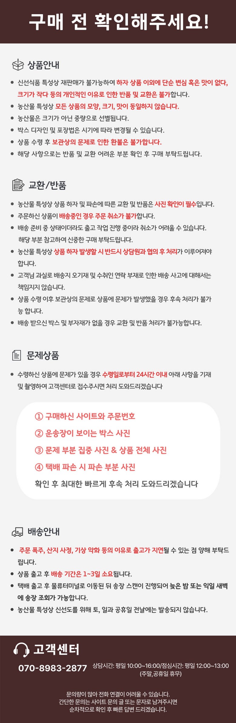 - ㆍ모니터 해상도의 차이로 인해 색상이나 이미지가 실제와 달라, 고객이 단순 변심으로 교환/반품을 무료로 요청하는 경우