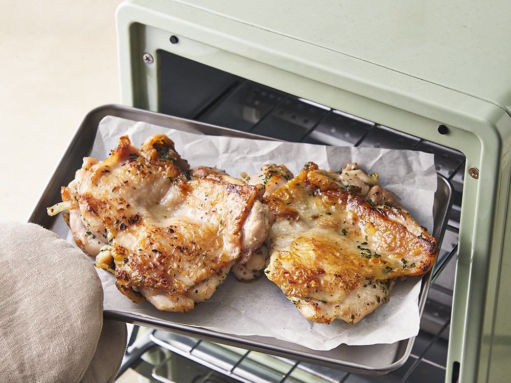 2. 치킨 스테이크를 겹치지 않게 넣어주세요.