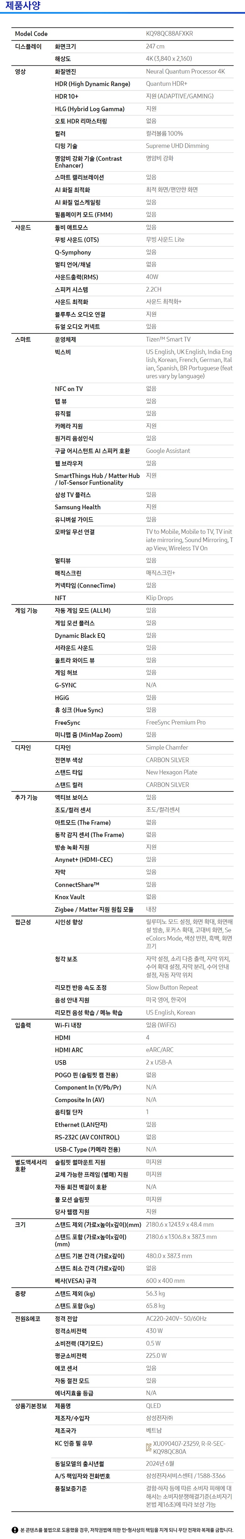 | 품명 및 모델명 | 삼성전자 4K UHD QLED TV, KQ98QC88AFXKR | KC 인증정보 | XU090407-23259, R-R-SEC-KQ98QC80A |