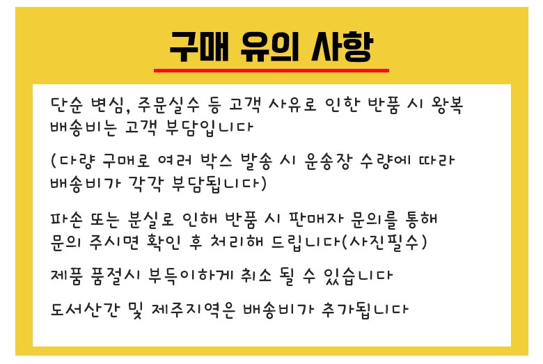 - ㆍ모니터 해상도의 차이로 인해 색상이나 이미지가 실제와 달라, 고객이 단순 변심으로 교환/반품을 무료로 요청하는 경우