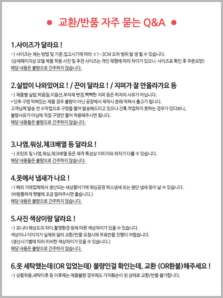 - ㆍ모니터 해상도의 차이로 인해 색상이나 이미지가 실제와 달라, 고객이 단순 변심으로 교환/반품을 무료로 요청하는 경우