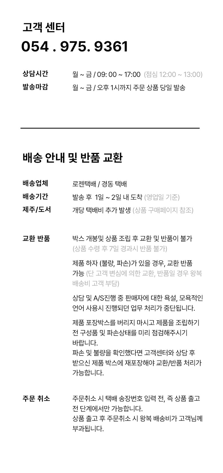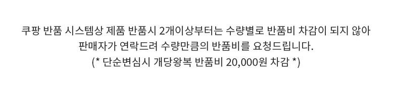 | 교환/반품 비용 (왕복비용) | 22,000원 - 단, 고객 변심의 경우에만 발생 - 도서산간 지역 배송불가 |