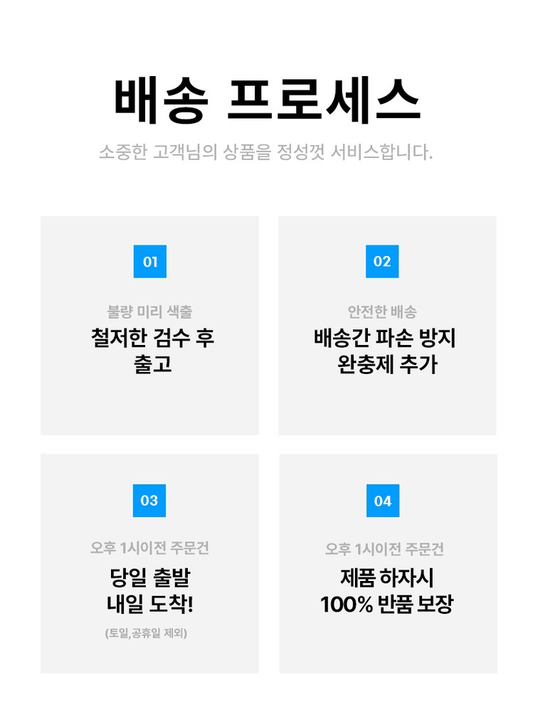 | 배송기간 | ㆍ도서산간 지역 등은 배송에 3-5일이 더 소요될 수 있습니다. - 천재지변, 물량 수급 변동 등 예외적인 사유 발생 시, 다소 지연될 수 있는 점 양해 부탁드립니다. | ||