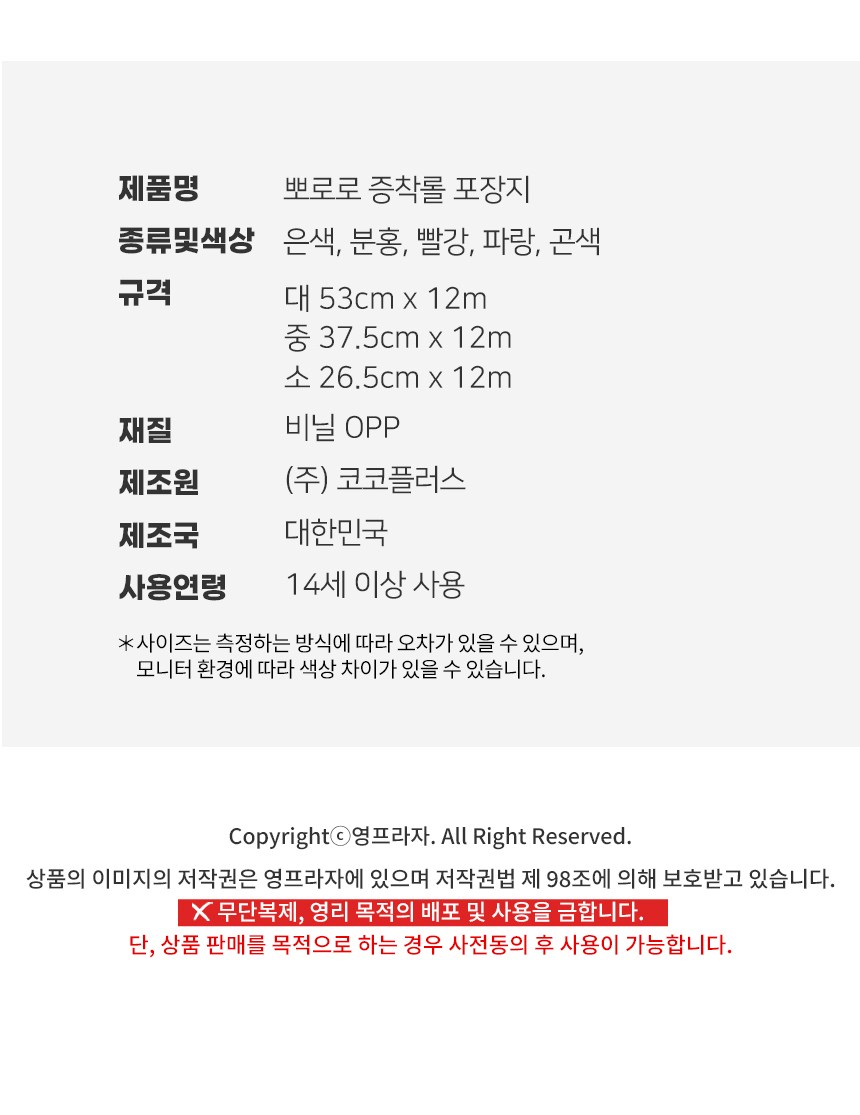 | 품명 및 모델명 | 코코플러스 뽀롱뽀롱 뽀로로 롤 포장지 26.5cm x 12m | 인증/허가 사항 | 해당없음(14세이상) |