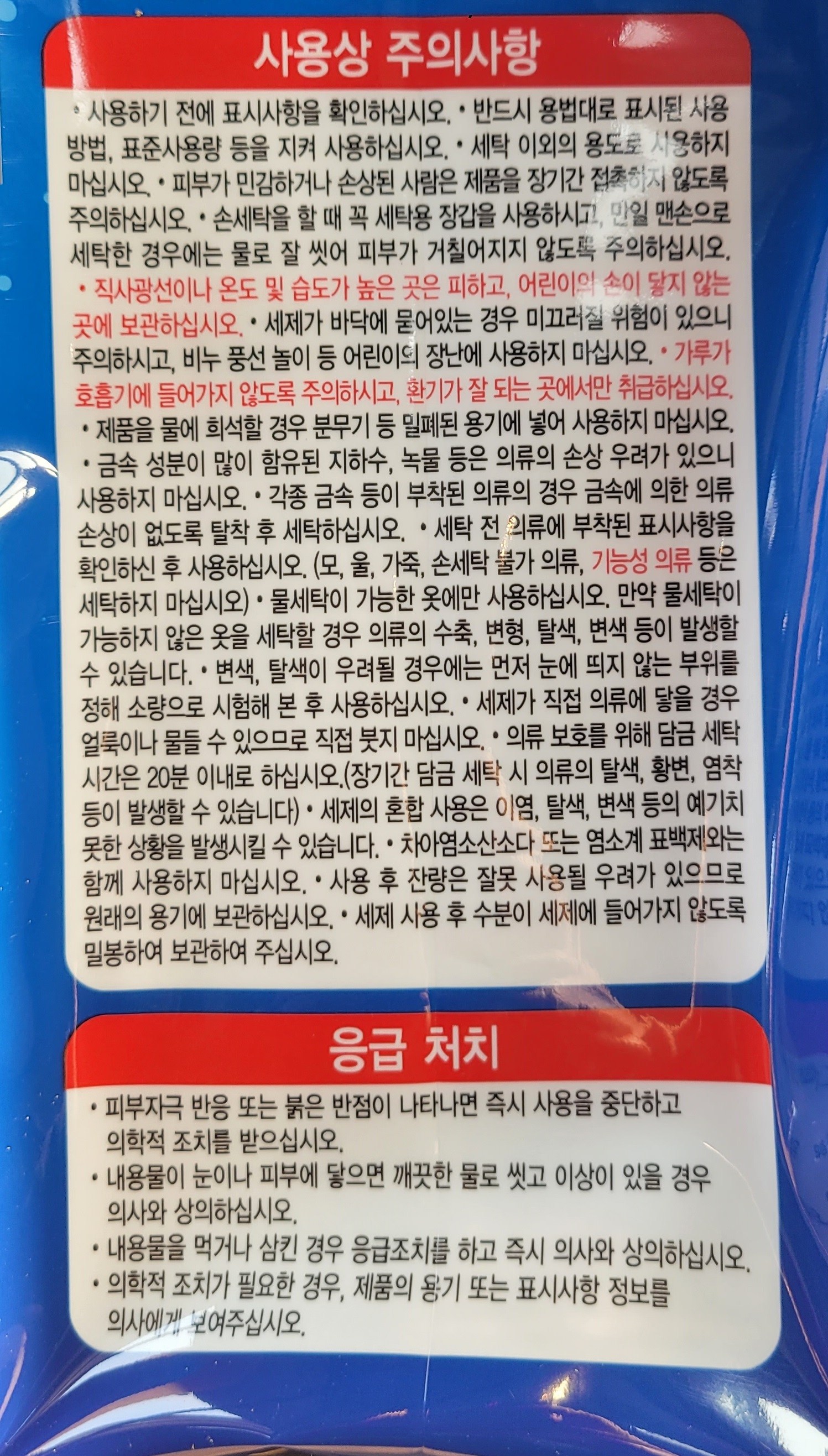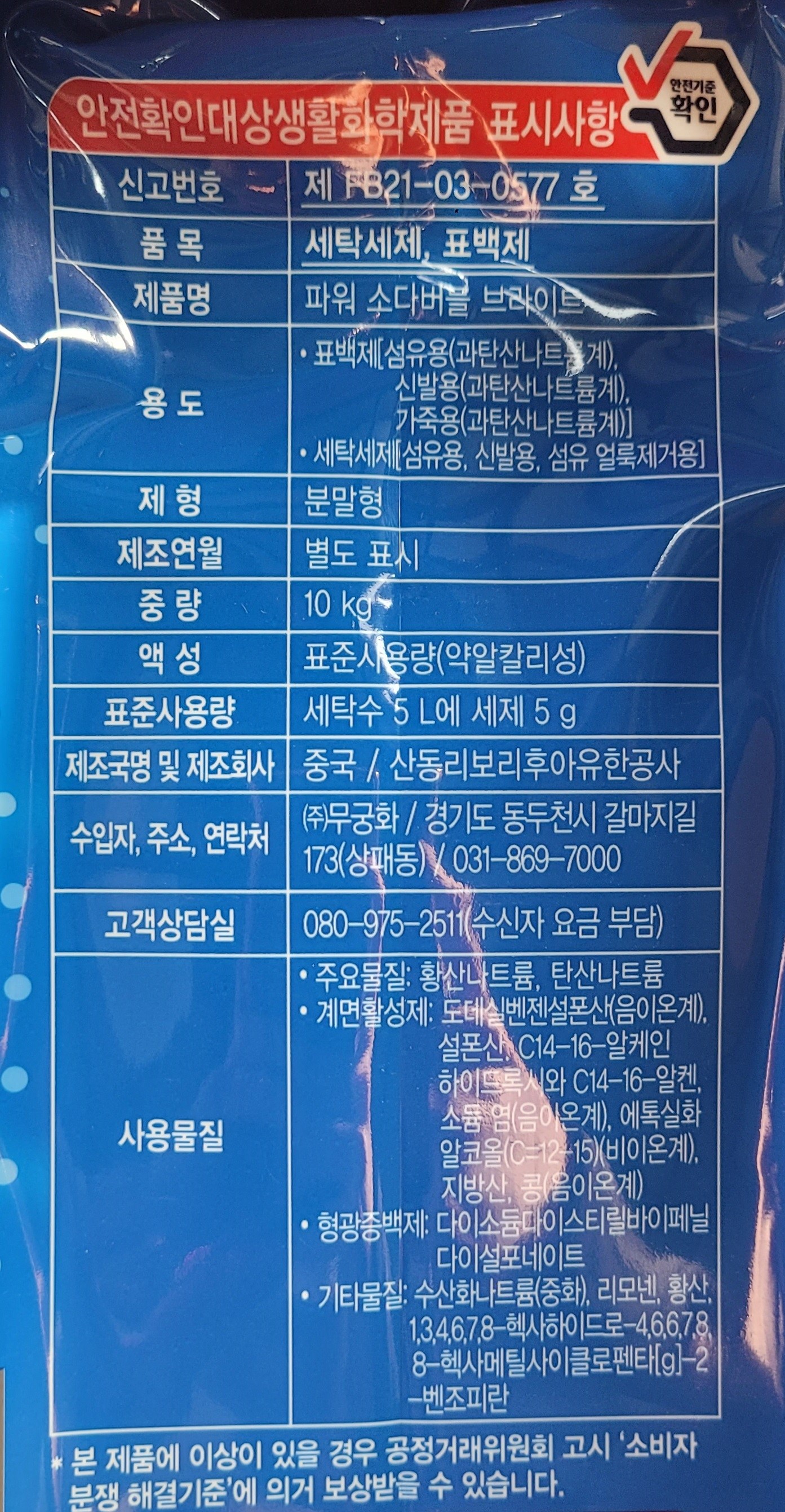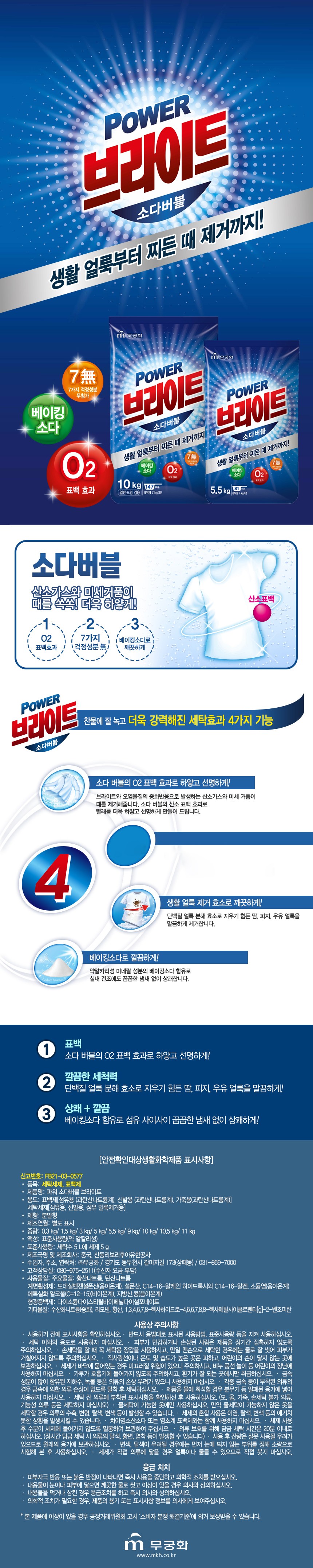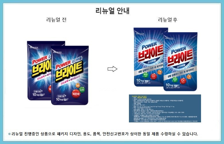 | 품목 및 제품명 | 표백제,세탁세제 / 파워 소다버블 브라이트 | 용도(표백제의 경우 계열을 함께표시) 및 제형 | 섬유용-과탄산나트륨계,가죽용-과탄산나트륨계,신발용-과탄산나트륨계,섬유 얼룩제거용,신발용,섬유용 / 비분사형-분말형 |