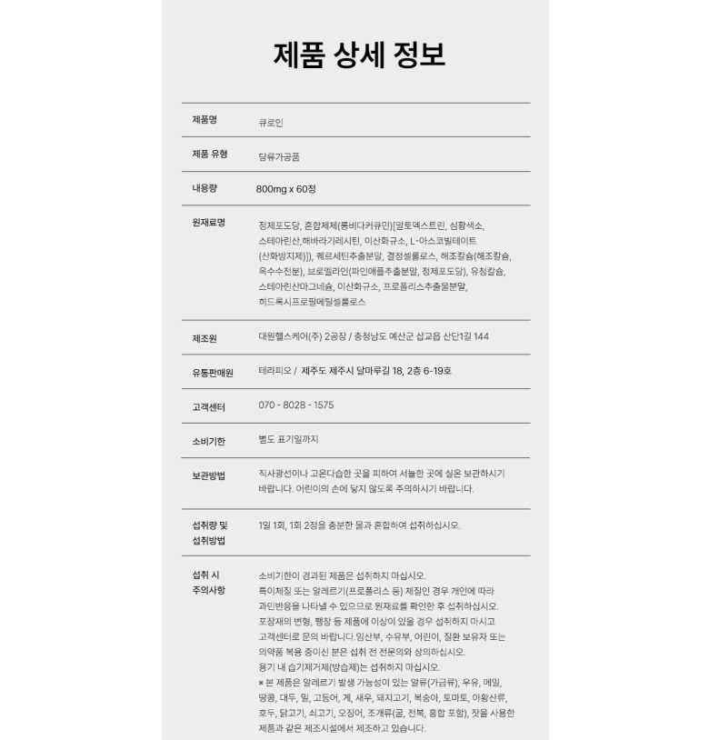 | 제조연월일, 소비기한 또는 품질유지기한 | 상품 상세페이지 참조 | 세부 품목군별 표시사항 | 상품 상세페이지 참조 |