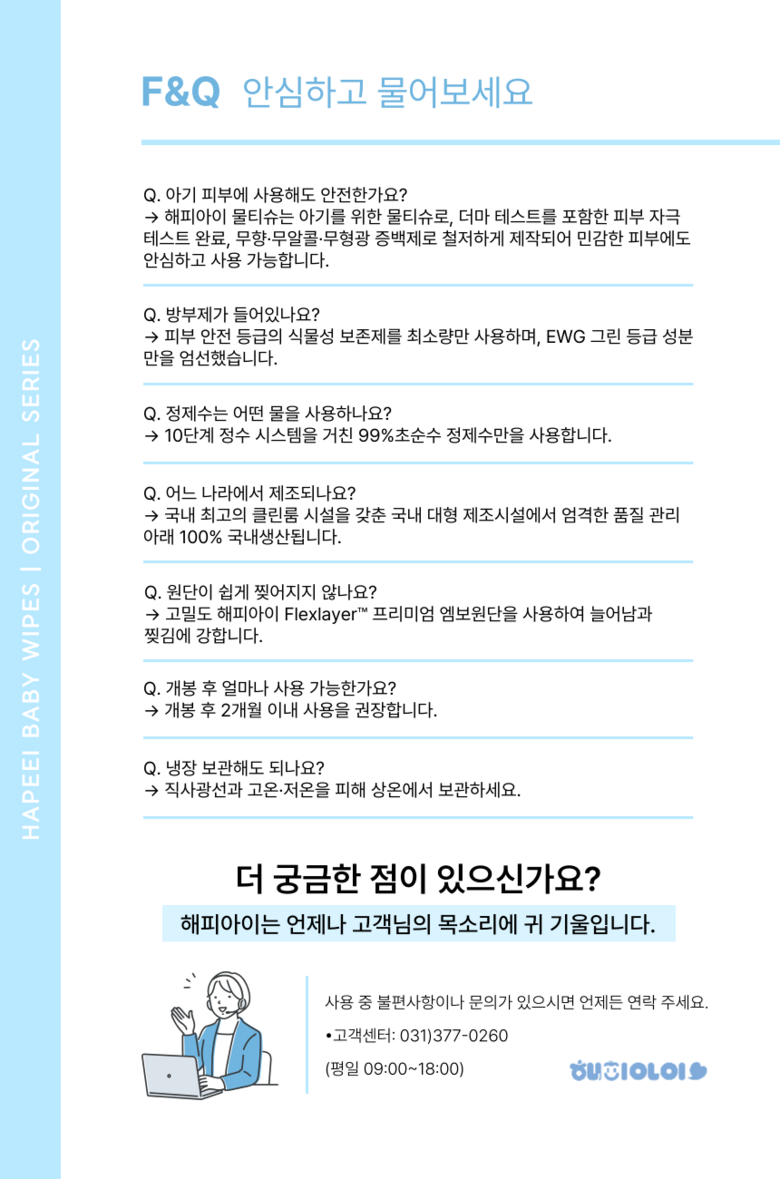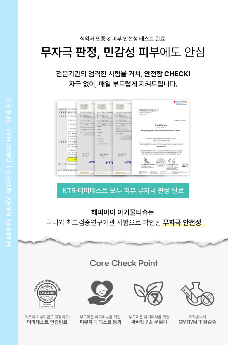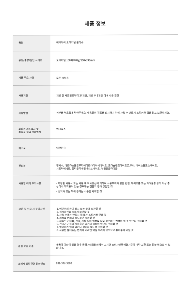 | 용량(중량) | 오리지널 100매/402g | 제품 주요 사양 | 모든 피부용 |