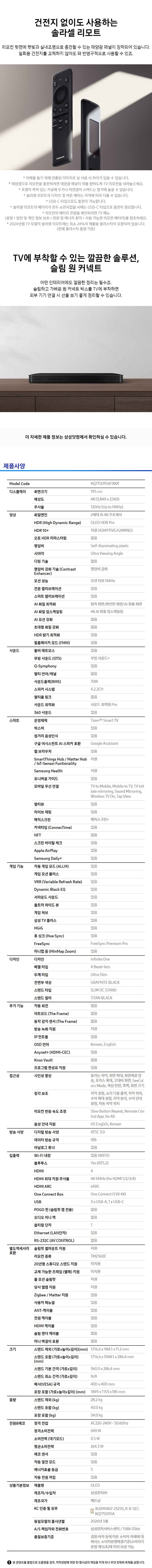 | 품명 및 모델명 | 삼성전자 OLED 4K UHD TV / KQ55SD95AFXKR | KC 인증정보 | 본품 : R-R-SEC-KQ77SD95A,XU090407-23270A, 리모컨 : R-C-SEC-VGTM2360E |