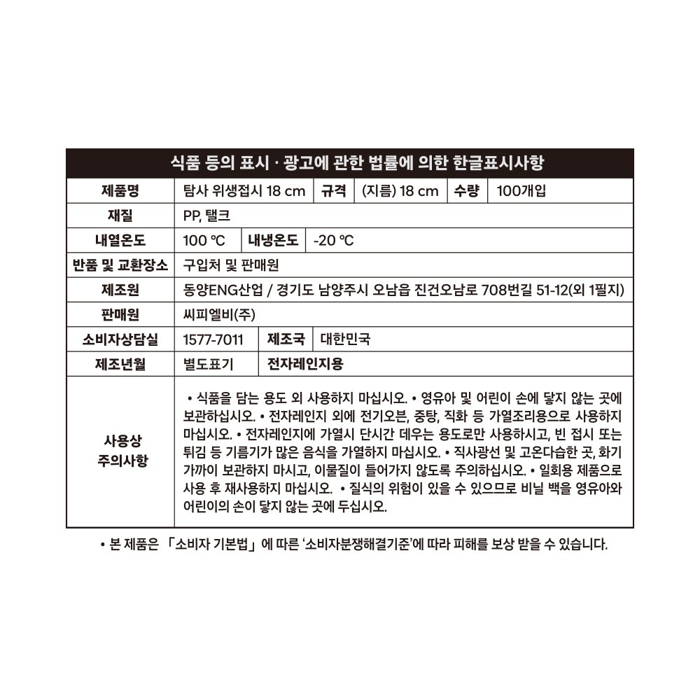 | 품명 및 모델명 | 탐사 위생접시 18cm, 100개입 | 재질 | PP+이산화규소(Sio3무기물) |