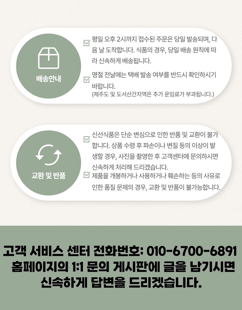 | 교환/반품 비용 (왕복비용) | 8,000원 - 단, 고객 변심의 경우에만 발생 - 도서산간 지역 배송불가 |