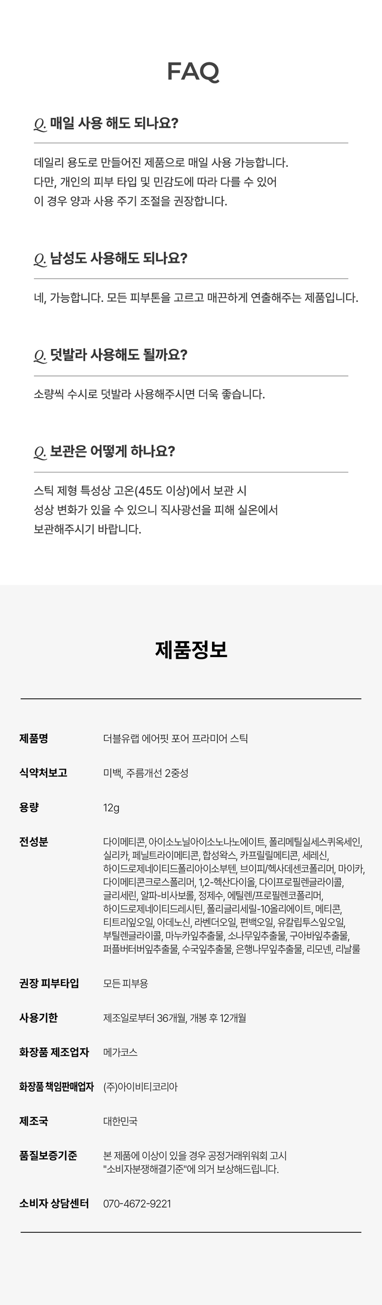 | 용량(중량) | 12g/ 0.42oz | 제품 주요 사양 | 모든 피부 타입 사용 가능 |