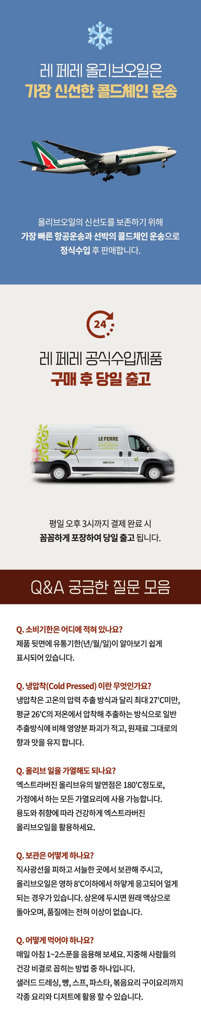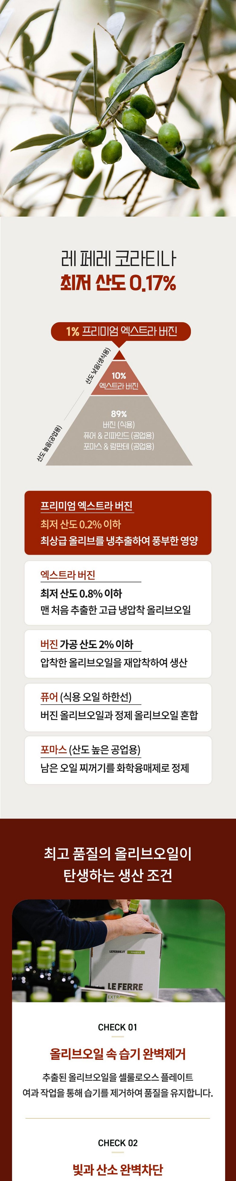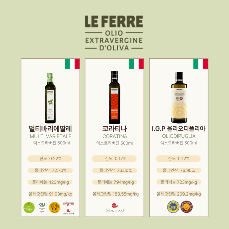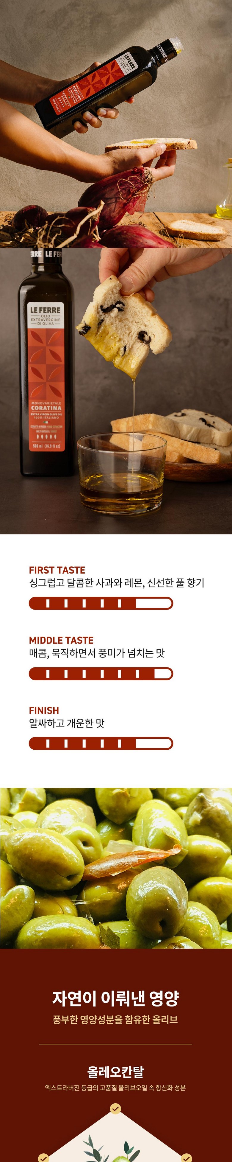 | 제품명 | 레 페레 엑스트라버진 코라티나 올리브오일 | 식품의 유형 | 올리브유(압착) |