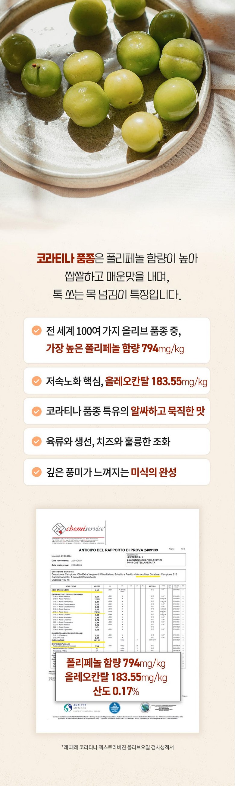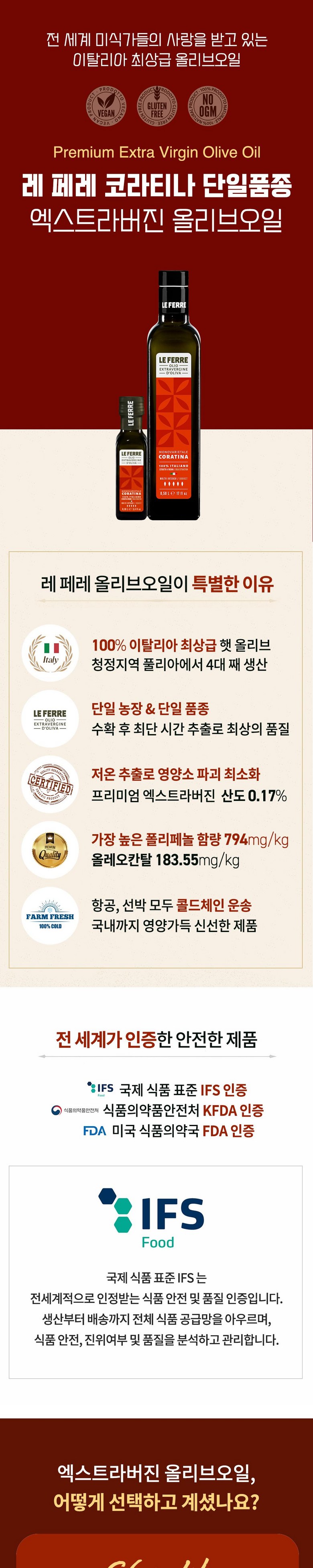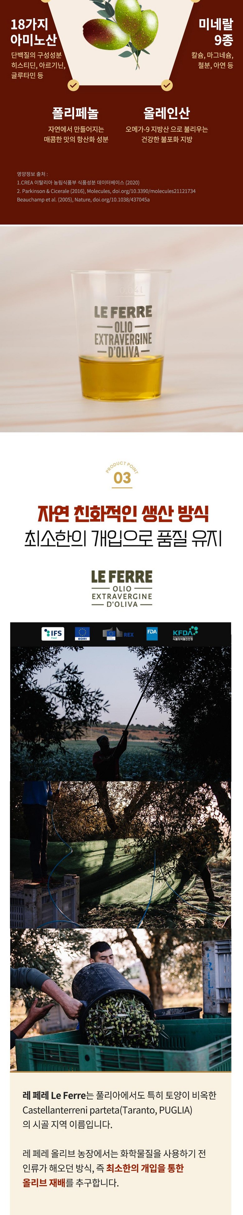 | 제품명 | 레 페레 엑스트라버진 코라티나 올리브오일 | 식품의 유형 | 올리브유(압착) |