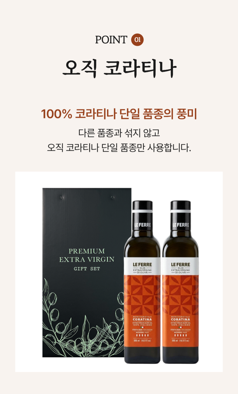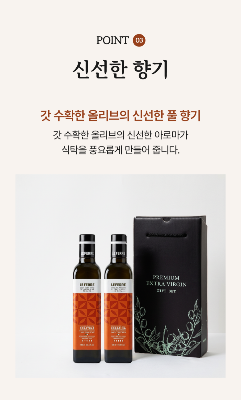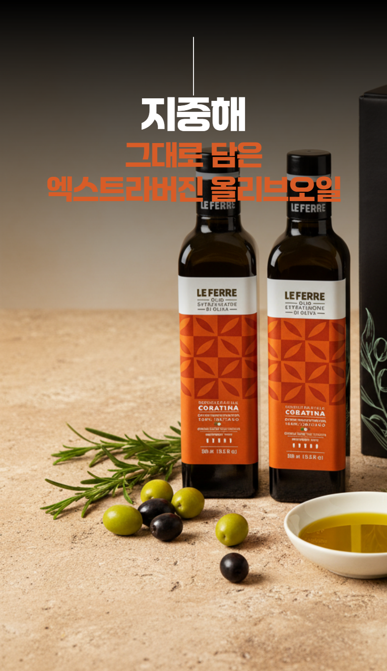 | 제품명 | 레 페레 엑스트라버진 코라티나 올리브오일 | 식품의 유형 | 올리브유(압착) |