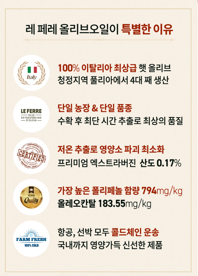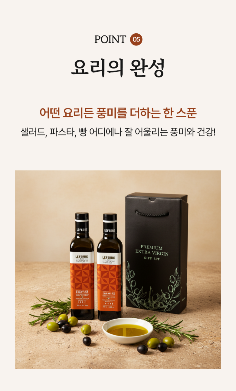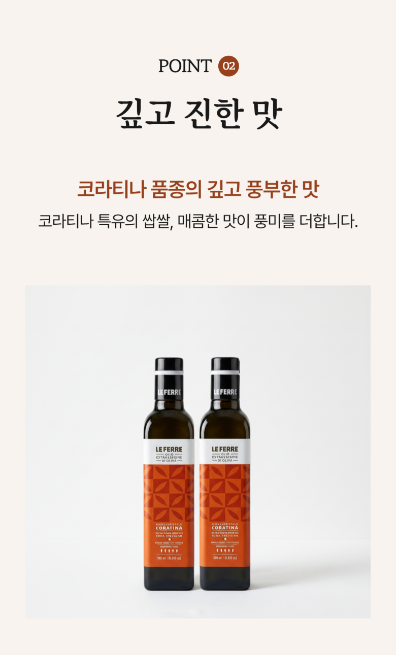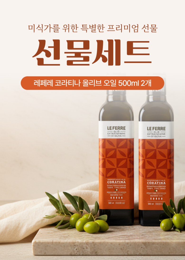 | 제품명 | 레 페레 엑스트라버진 코라티나 올리브오일 | 식품의 유형 | 올리브유(압착) |