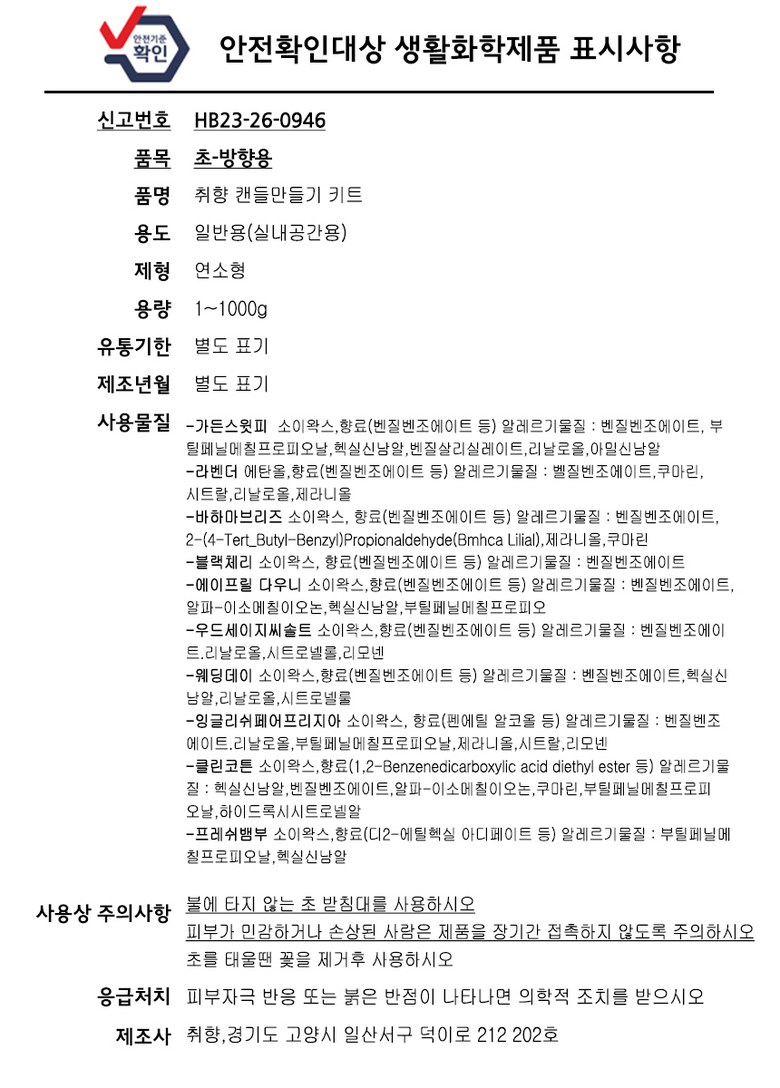 | 품명 및 모델명 | 취향 캔들만들기 키트 | 인증/허가 사항 | HB23-26-0946 |