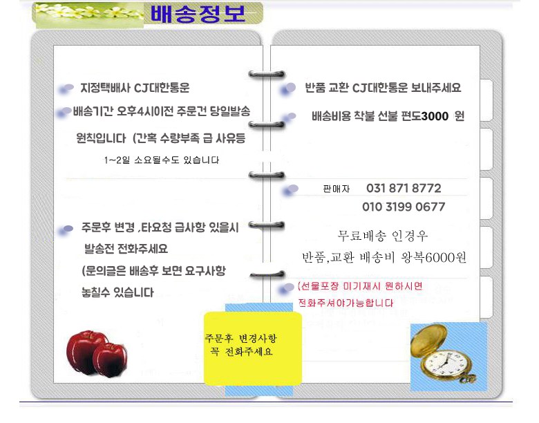 | 배송기간 | ㆍ도서산간 지역 등은 배송에 3-5일이 더 소요될 수 있습니다. - 천재지변, 물량 수급 변동 등 예외적인 사유 발생 시, 다소 지연될 수 있는 점 양해 부탁드립니다. | ||
