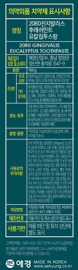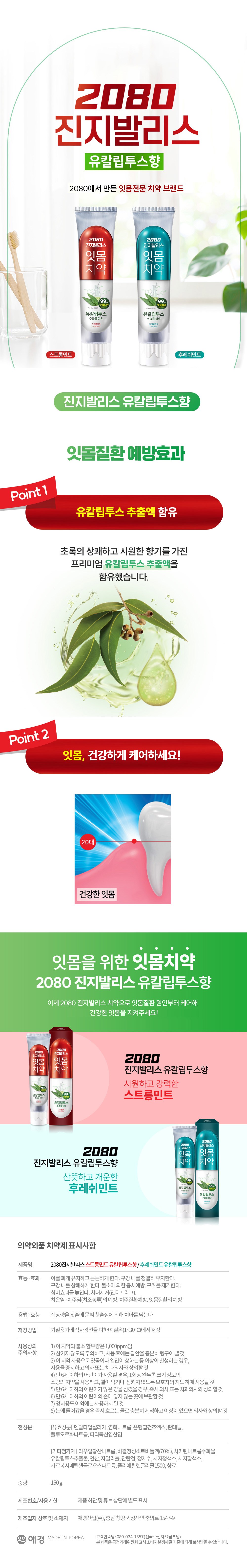 | 품명 및 모델명 | 2080진지발리스 후레쉬민트 유칼립투스향 | 인증/허가 사항 | 의약외품 |