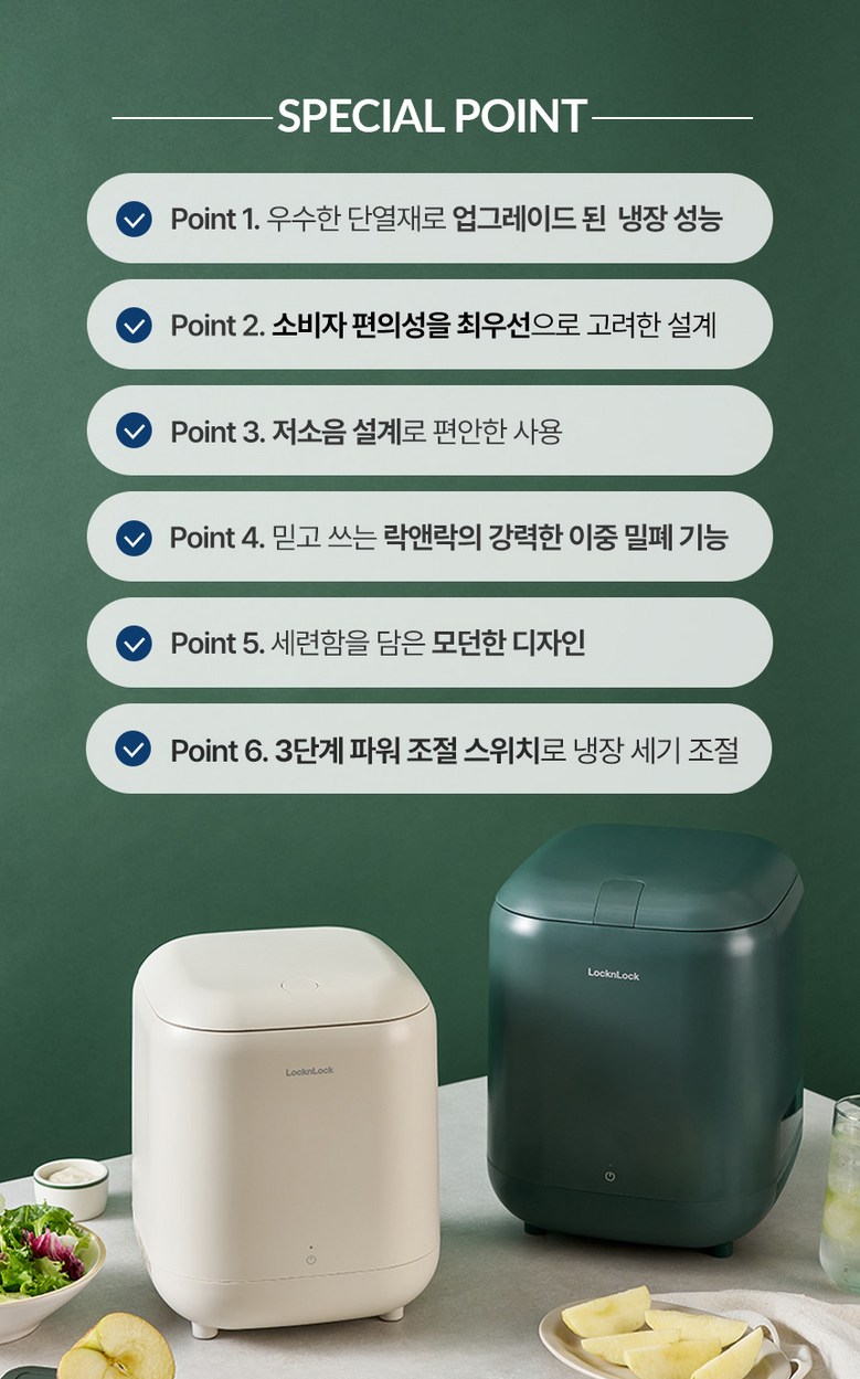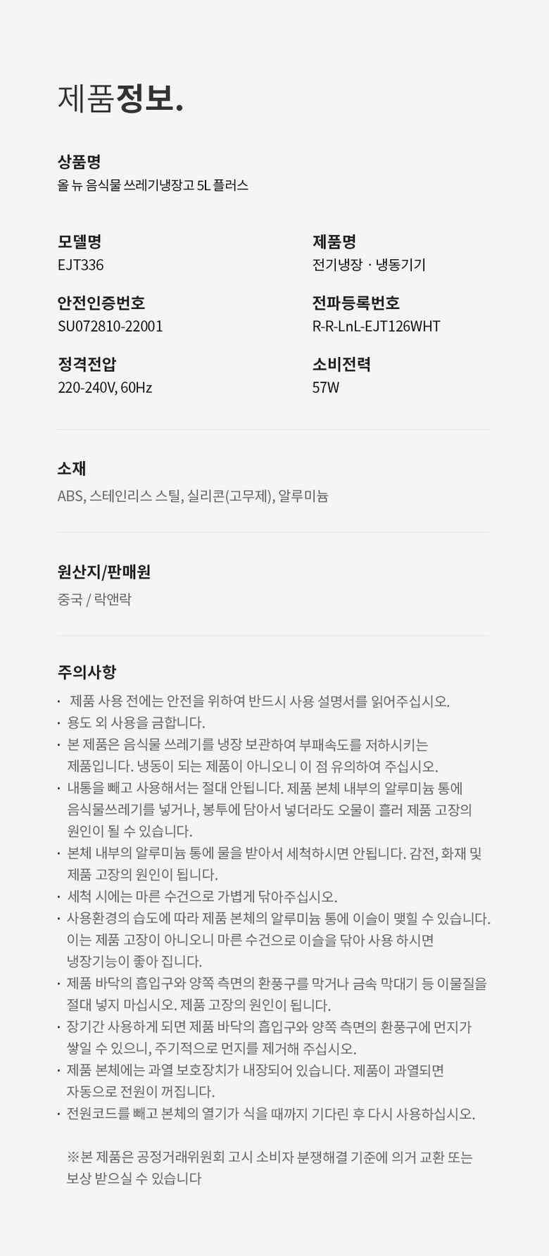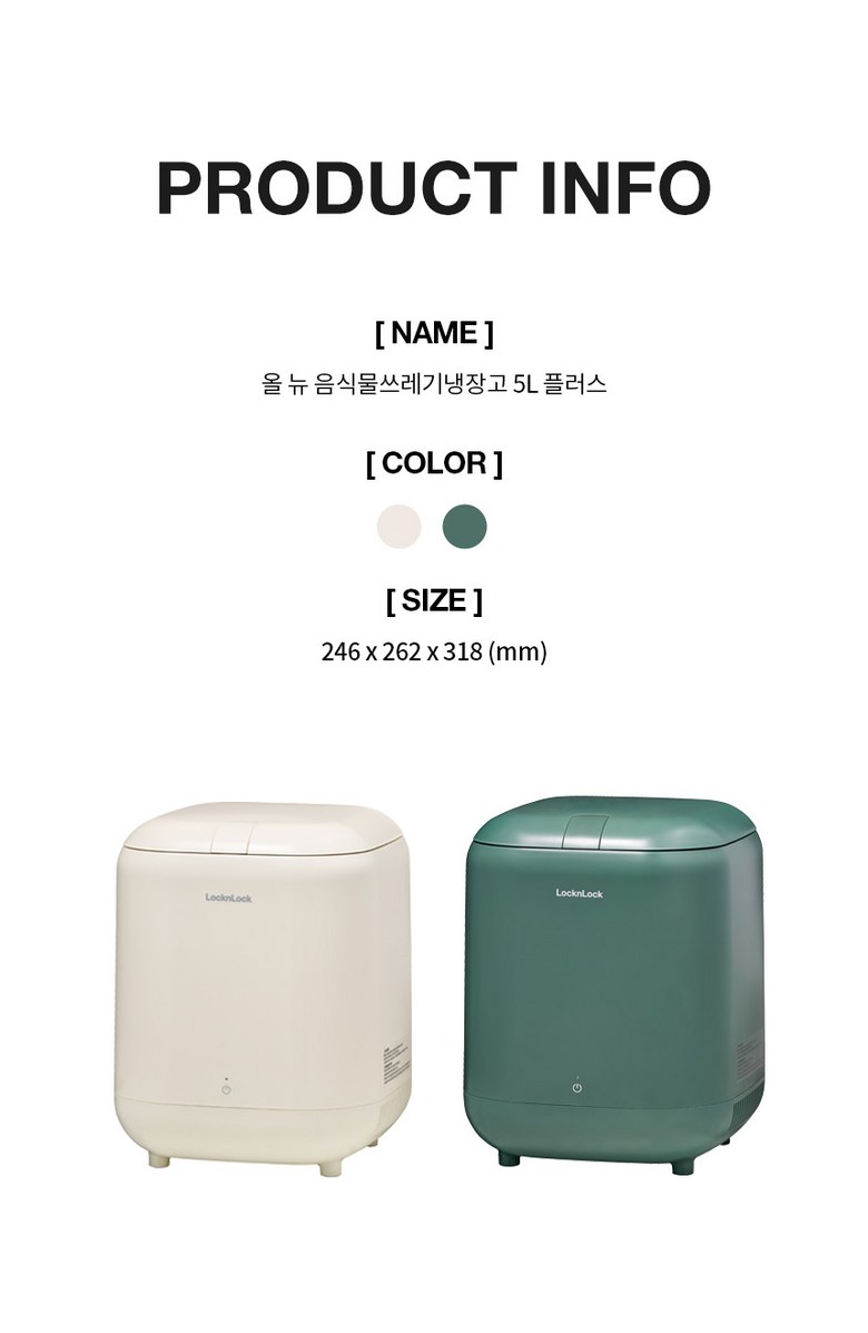 | 품명 및 모델명 | 락앤락 음식물 쓰레기냉장고 5L 플러스(냉장조절기능추가) EJT336 | 인증/허가 사항 | 전기용품 안전인증_국가인증 SU072810-22001 |