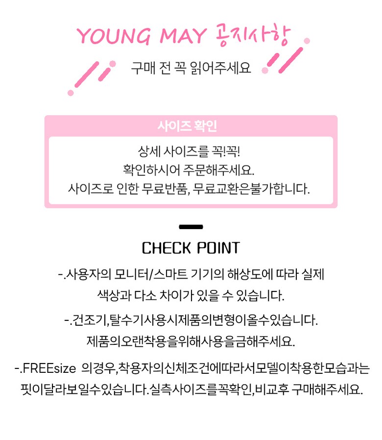 - ㆍ모니터 해상도의 차이로 인해 색상이나 이미지가 실제와 달라, 고객이 단순 변심으로 교환/반품을 무료로 요청하는 경우